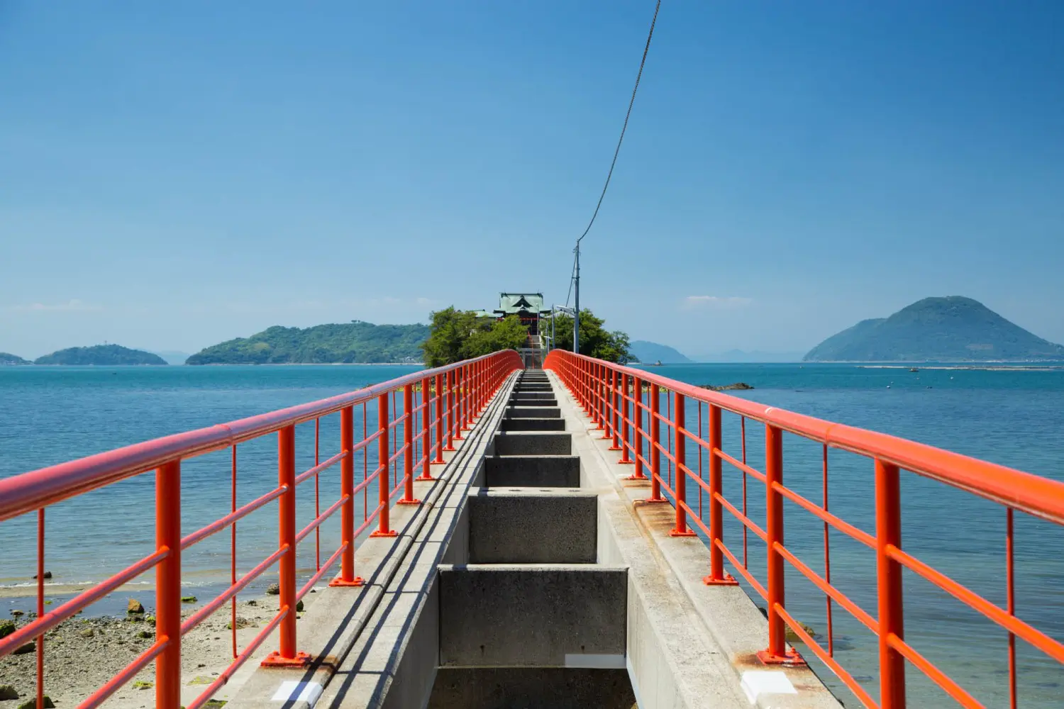 位於瀨戶內海的小島「津嶋神社」,是守護孩子健康與成長的神祇,自400多年前便受到當地居民的敬仰。每年僅在8月4日與5日的夏季大祭期間,島上才會與對岸搭建連接的渡橋,吸引眾多帶著孩子的家庭以及情侶、夫妻前來參拜,傳說走過這座橋的人將獲得幸福與祝福。