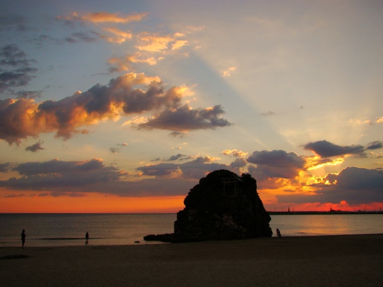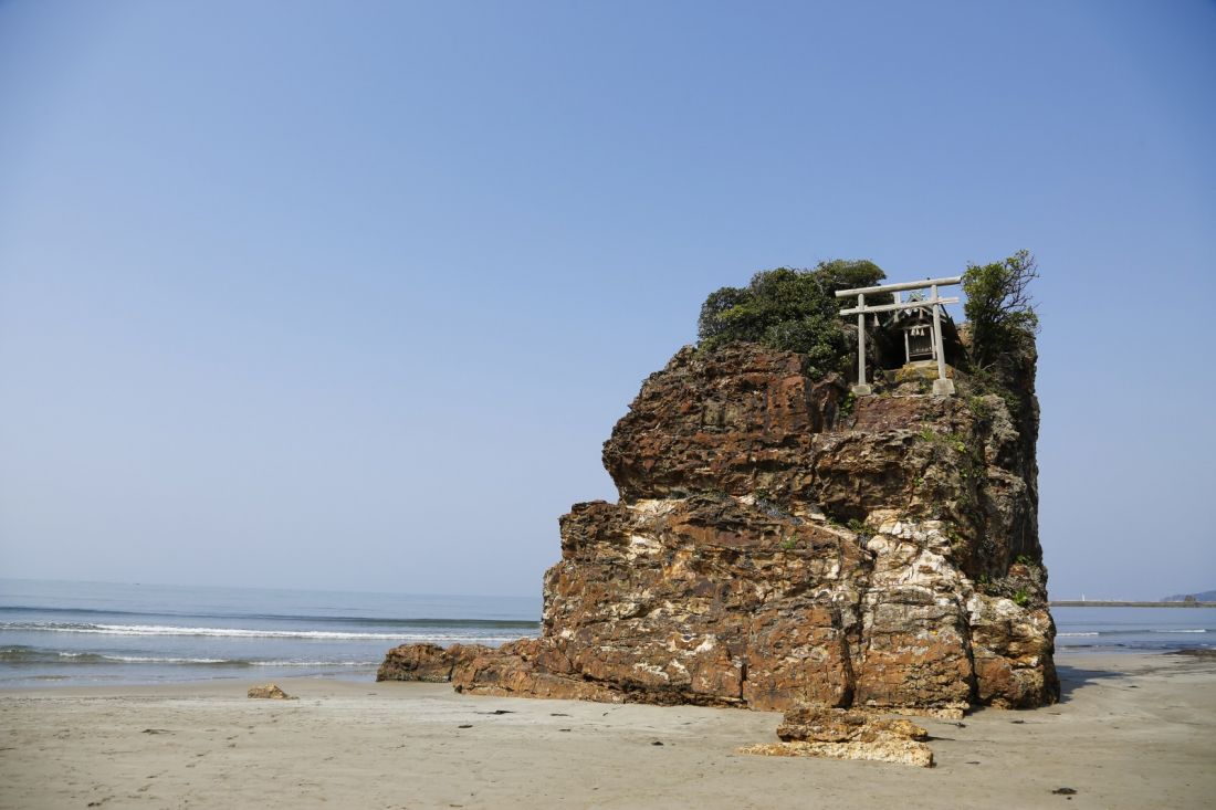 沙灘上最具特色的是矗立著的巨大岩石「弁天島」,供奉著豐玉毘古命(とよたまひこのみこと)。