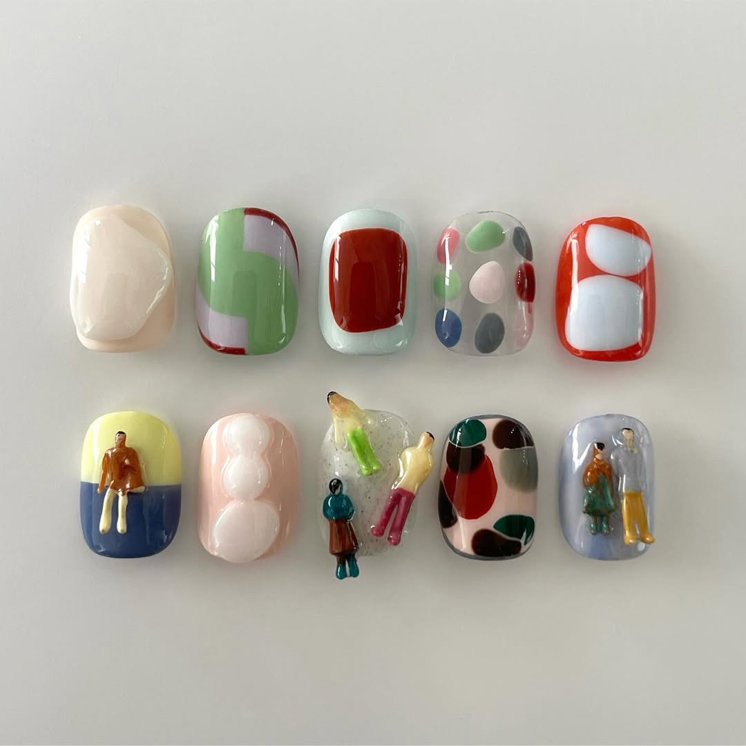 喜歡繽紛感指彩的話,不妨嘗試以幾何塗鴉風格呈現,利用多色混和的配色巧思,去除繁複的裝飾,使指尖不會顯得太過華麗,反而增添一股簡約知性,結合幾何線條點綴,讓指尖擁有滿滿細節焦點。