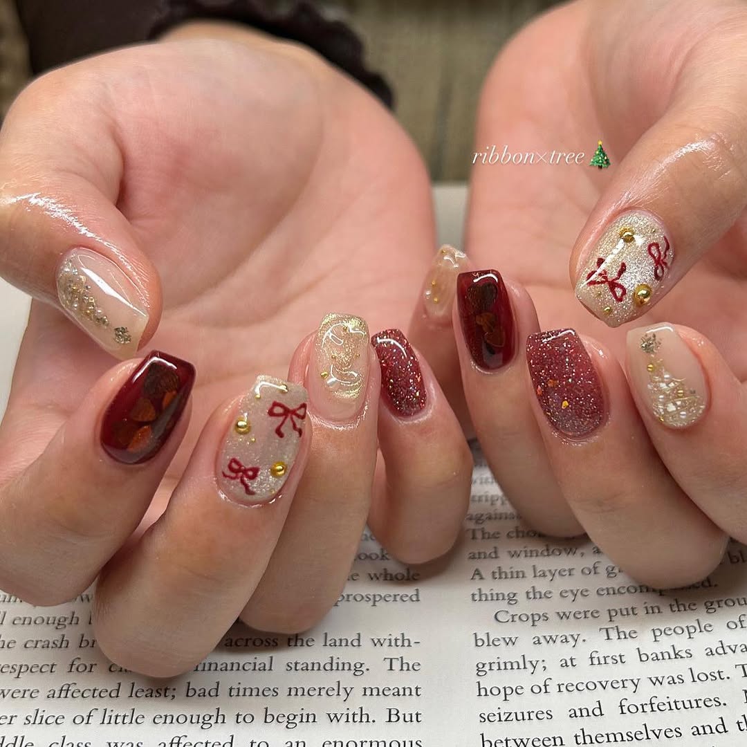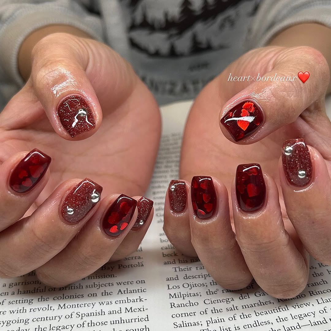 當想為指尖注入幾分甜美可愛時,推薦選擇非常適合過年使用的紅色系指彩,以紅色打底並加上愛心、亮粉、蝴蝶結等混和,利用同色圖案疊加,立即讓手部展現少女心滿分的輕甜氛圍。