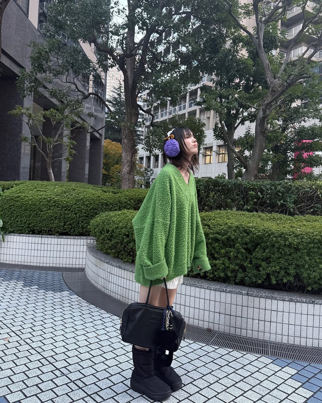 本田翼的日常私服,經常透過寬感上衣 + 短褲呈現造型,例如亮綠色 V 領針織衫與短褲混合,加上雪靴露出修長的腿部線條,使身形更加顯高顯瘦之外,本田翼也很喜歡利用配件、包包等單品加乘,讓造型度更完整加分。