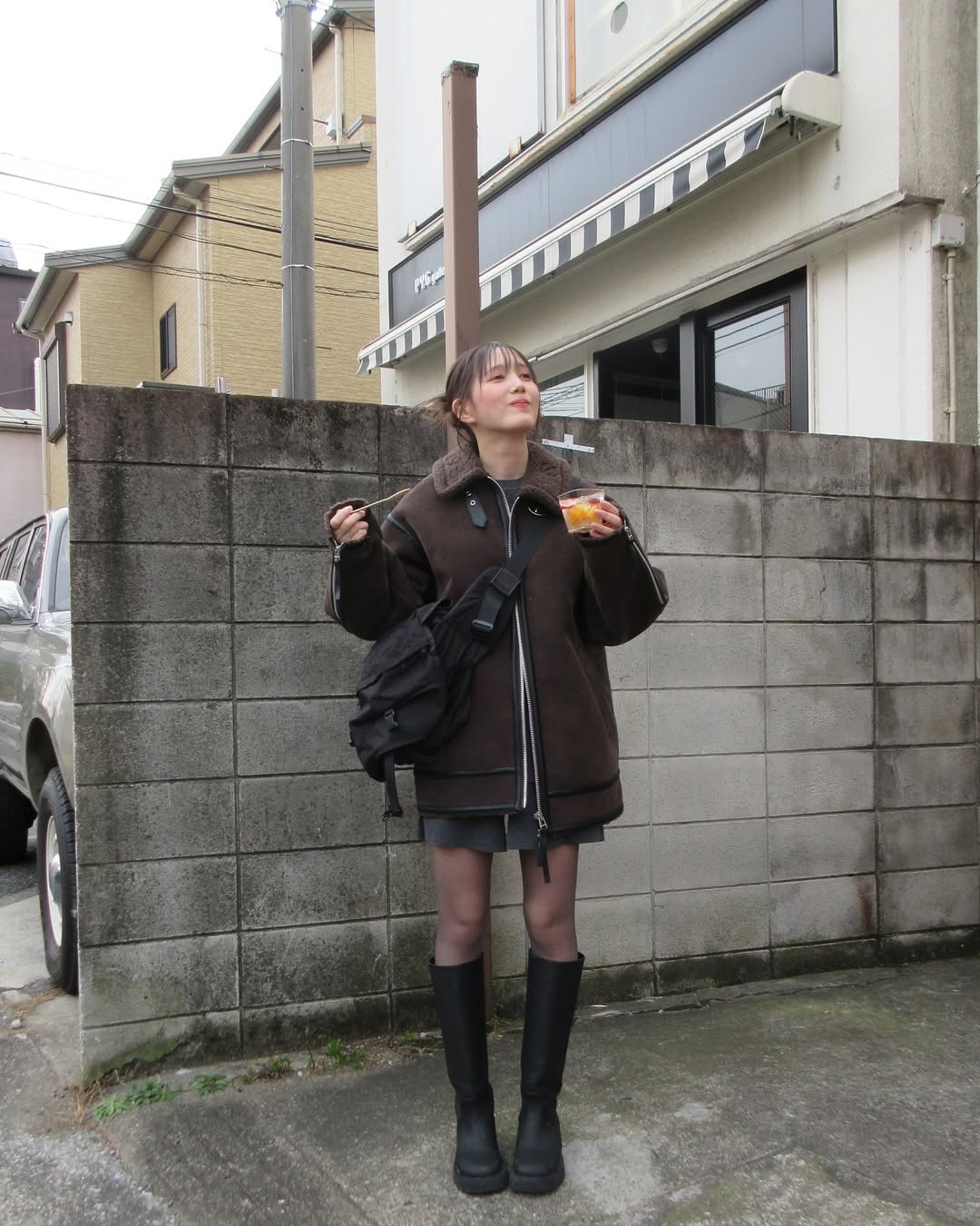 第二套換上長版翻領外套,同樣以短裙混搭的造型技巧,再隨性加上側背包與長靴,瞬間營造簡約個性的日系風格,如果想讓腿部瘦感更顯著的話,可以偷學本田翼運用透膚長襪混合,讓想製造的修飾度輕鬆擁有。
