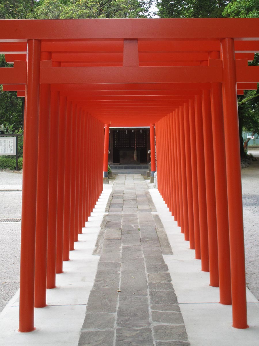 神社入口的巨大紅色鳥居十分壯觀,象徵通往神聖之地的門戶。境內有多棵參天古樹,讓人感受到自然的靜謐與力量。