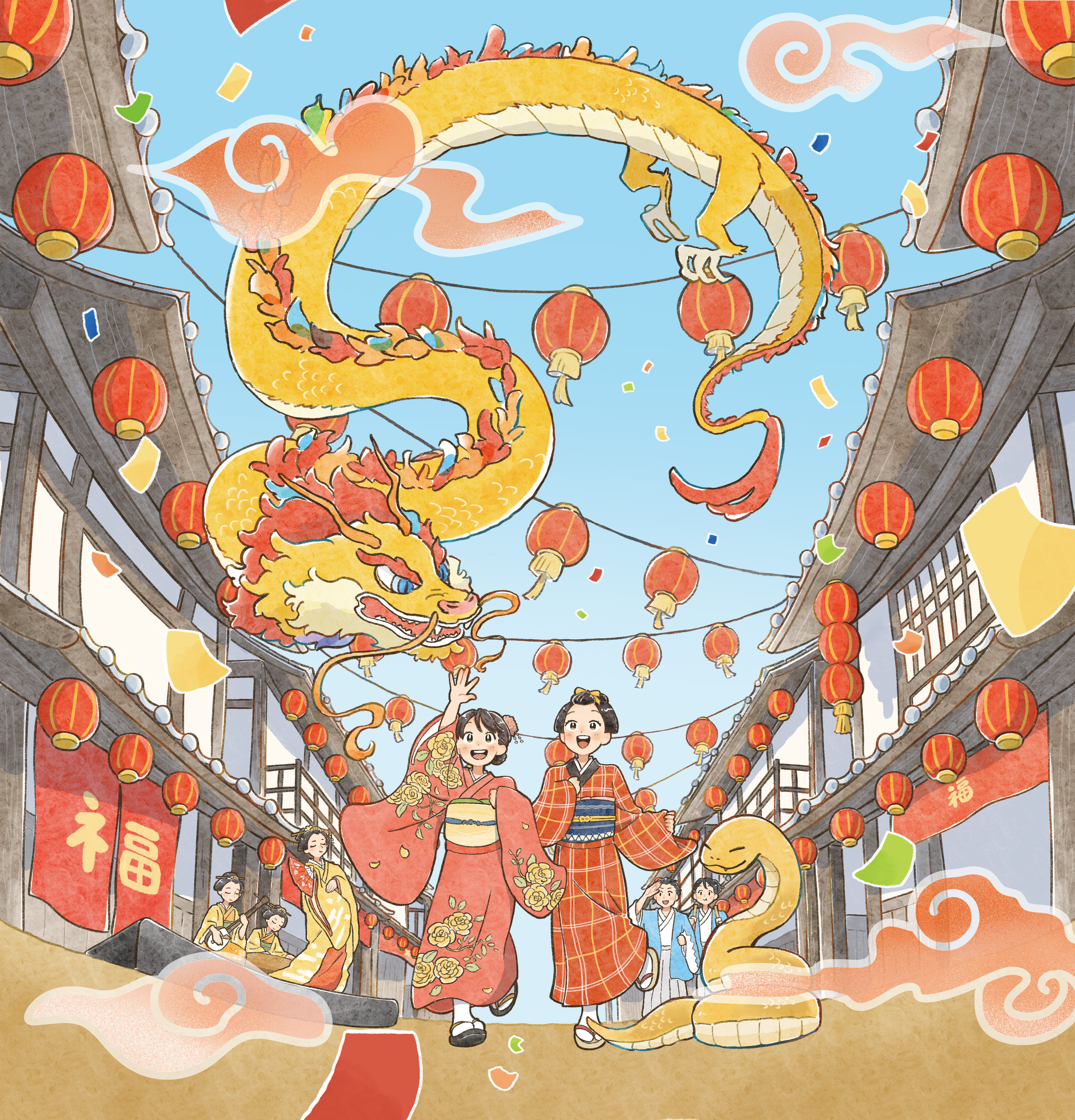 隨著春節到來,東映太秦映畫村特別推出了期間限定的活動「映畫村紅金春節祭」。1月25日至3月2日期間,古樸的江戶街道掛滿了紅色燈籠,武士與江戶市民身著紅金服飾熱情迎接,園區內還設有金色巨蛇的拍照打卡點,並推出春節限定的創意美食,以熱鬧十足的「紅」與「金」意象,歡迎國內外遊客一同共度新春時光。