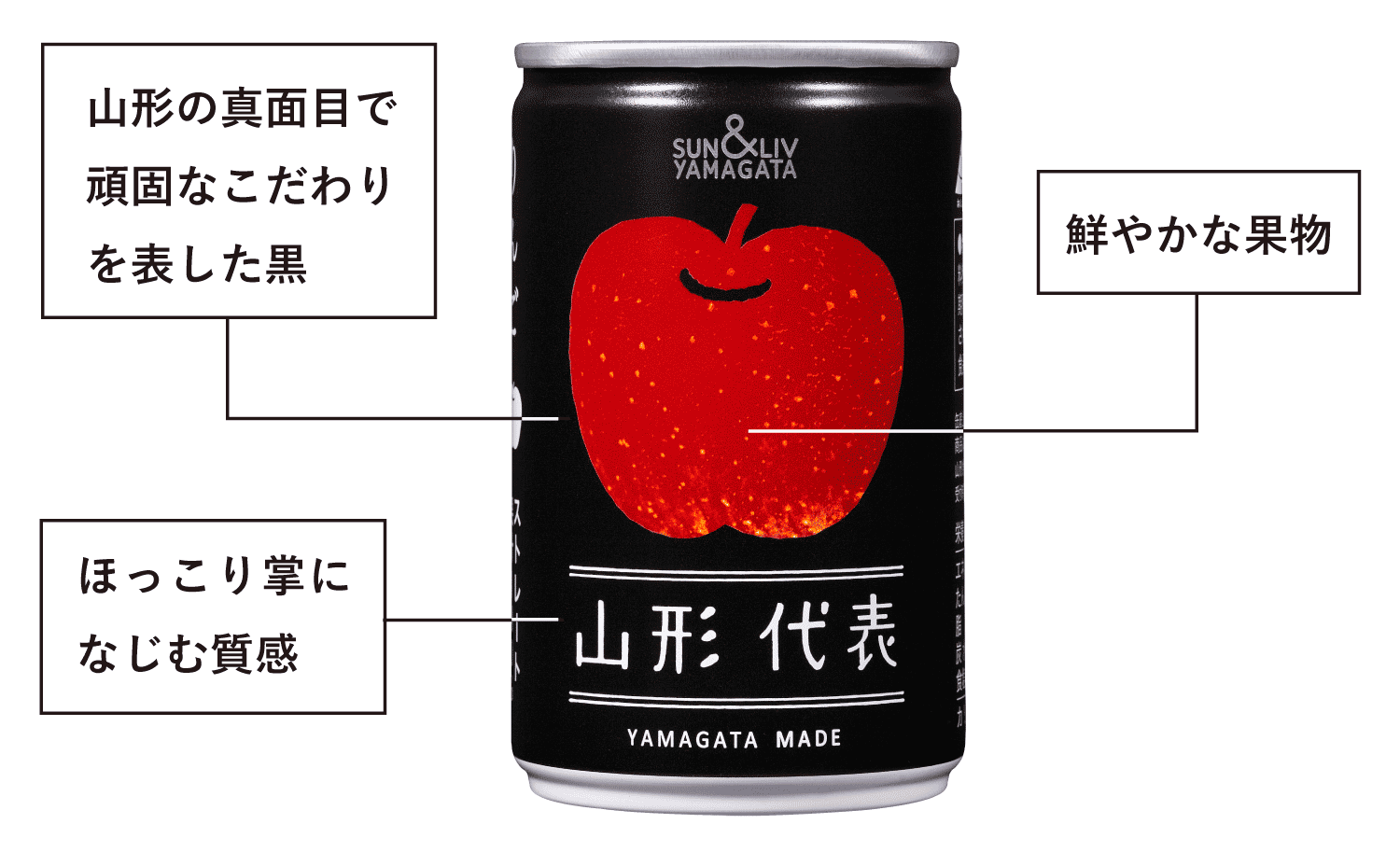 「山形代表」大膽挑戰果汁界的常規,選擇深邃而優雅的黑色作為主色調,象徵執著與真誠,如同果汁本身,100%純粹且直白。在深沉迷人的黑色背景上,色彩繽紛的水果熠熠生輝,彷彿自信滿滿地微笑著,以最驕傲的姿態迎接每一位品嚐者。