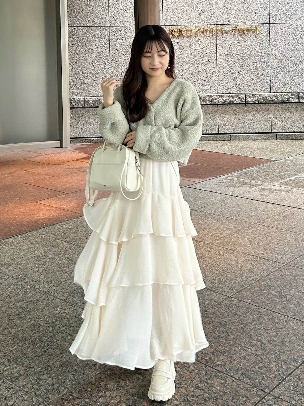 衣櫃裡一定都有的蛋糕裙款,層層拼接的設計,使走路時擁有浪漫飄逸的氛圍,上衣選搭針織開襟衫,傳達優雅兼具的女孩感受,再搭配微捲長髮、隨性拎個手拿包,便能呈現魅力加分的情人節穿搭。