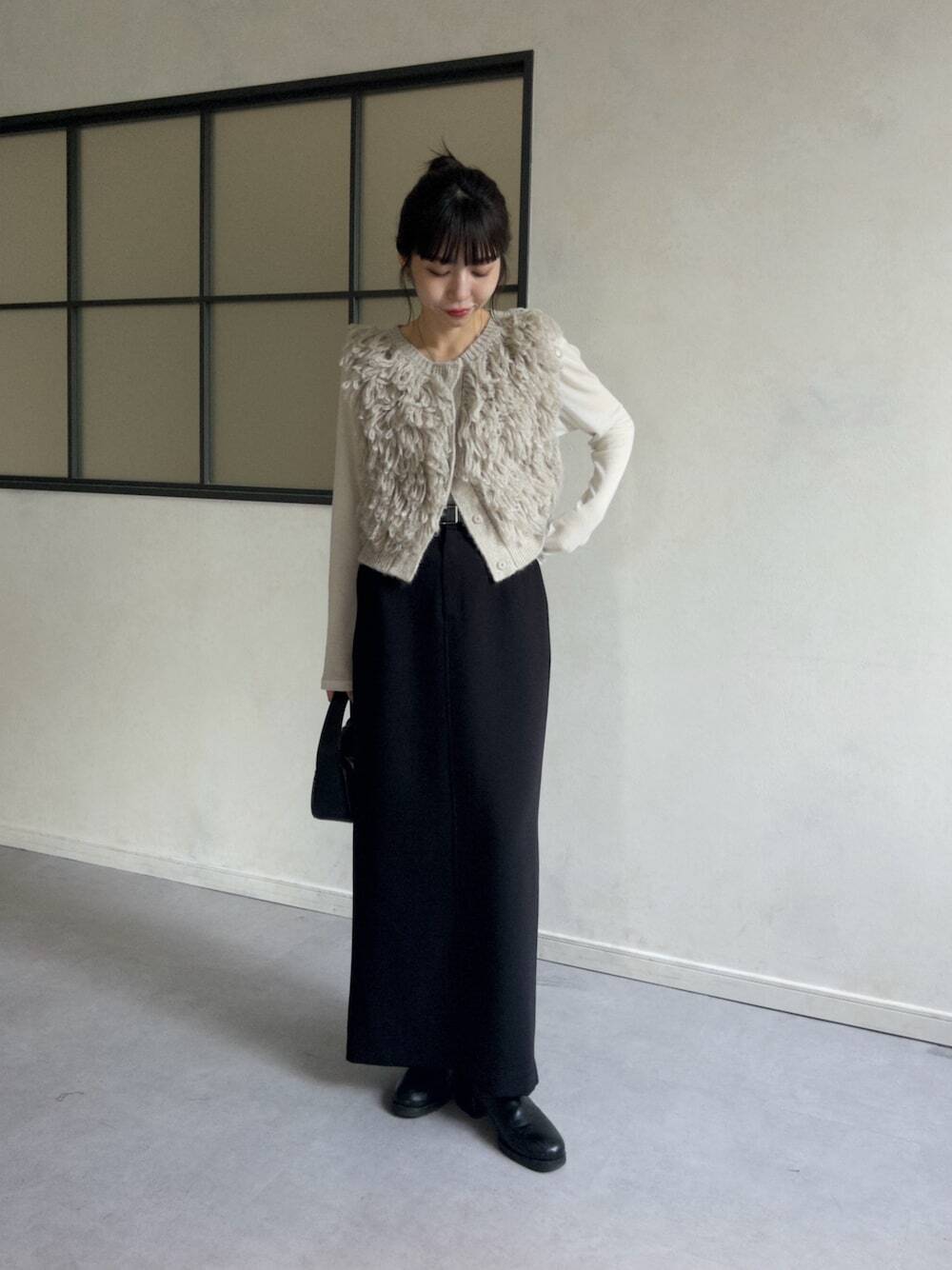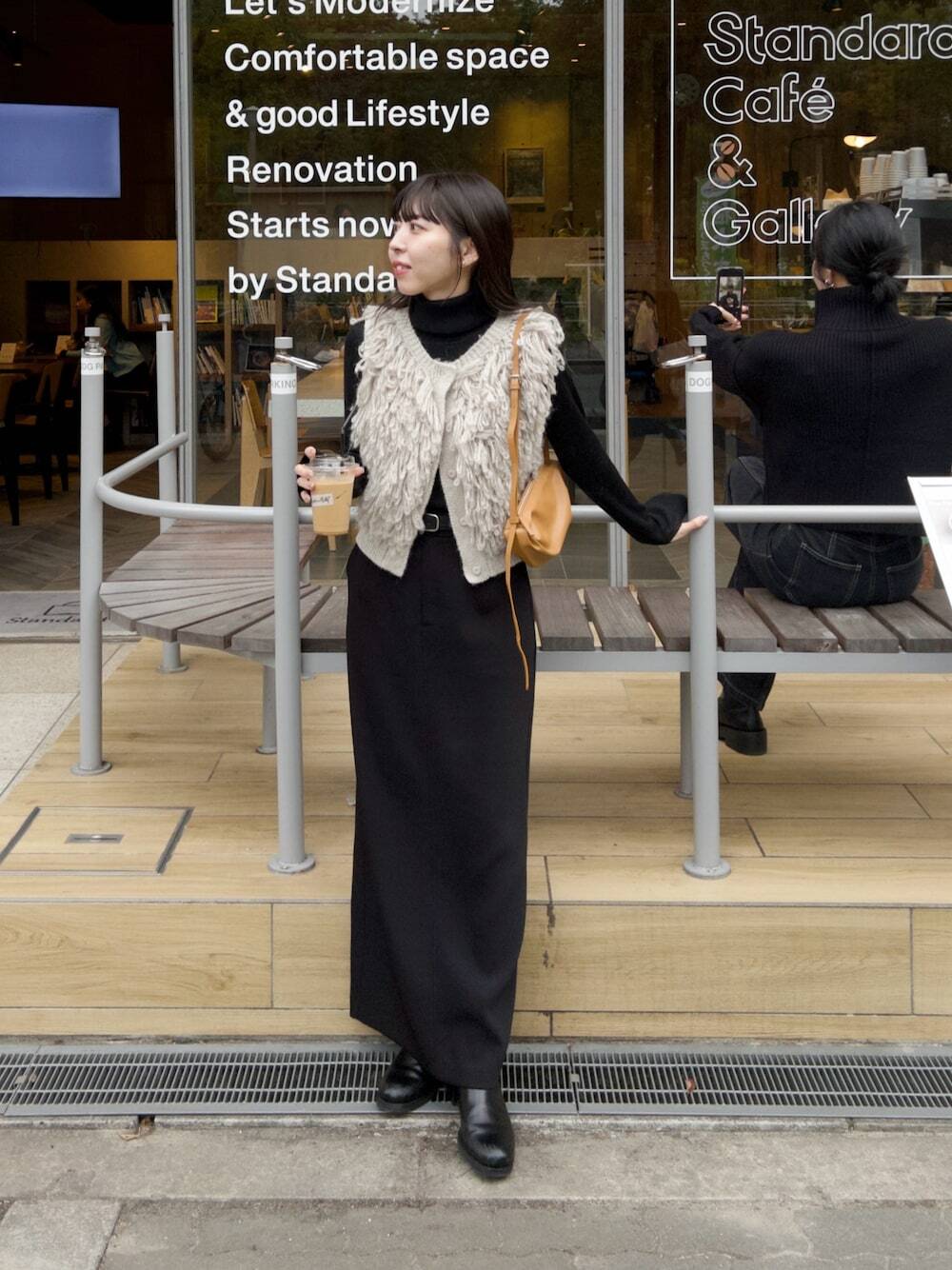 平時比較喜歡俐落感造型的話,不妨嘗試選搭黑色直筒長裙,俐落筆直剪裁,能快速修飾臀部與大腿肉肉,上衣融入毛毛、蕾絲拼接背心,並內搭一件圓領或高領長袖上衣,輕鬆點亮層次注目的視覺印象。