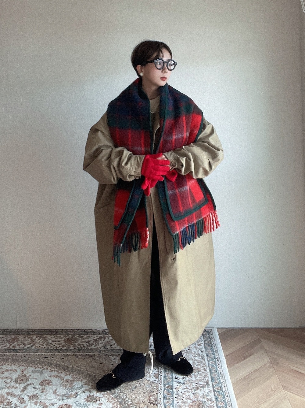 另外,除了圍在脖子的圍法風格,其實也可以透過圍巾變換成披肩,例如不刻意的披在手臂後,從胸前打兩個結,或者把圍巾掛在脖子上,且將兩邊拉開自然垂墜,瞬間打造慵懶鬆弛感的日系印象。