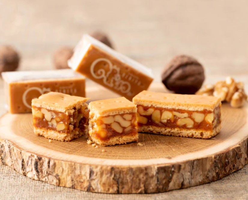 鎌倉紅谷的經典人氣商品核桃糕(クルミッ子)是在濃郁奶油香氣的餅皮中,夾入自家製焦糖包裹的核桃,焦糖帶來濃郁的甜味,卻不顯膩口,核桃與焦糖的黃金比例,加上札實的餅皮,讓整體口感更加和諧。這三種食材交織出的絕妙平衡,造就了奢華的美味。特別是在夏季,冷藏後享用,更能帶來獨特的清爽風味。