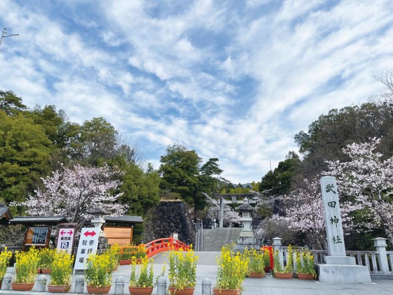 創建於大正8年,供奉戰國時代著名名將「武田信玄公」,位於甲斐武田氏三代居館「躑躅崎館」的遺址上,該地現已被指定為國家史跡。神社境內仍保留著當時的土壘與護城河等遺構,讓人能夠感受到濃厚的戰國風情。境內環繞著自創建當時便由縣內各地捐贈的眾多樹木,四季更迭之美令人陶醉,春天賞櫻、秋天賞楓尤為迷人。武田神社更是著名的「勝運」能量景點,不僅能帶來勝利的運勢,據說還有「戰勝人生與自我」的神祕加持。境內另有一棵稀有的「三葉松」,撿拾其落葉隨身攜帶,據說能帶來金錢運。