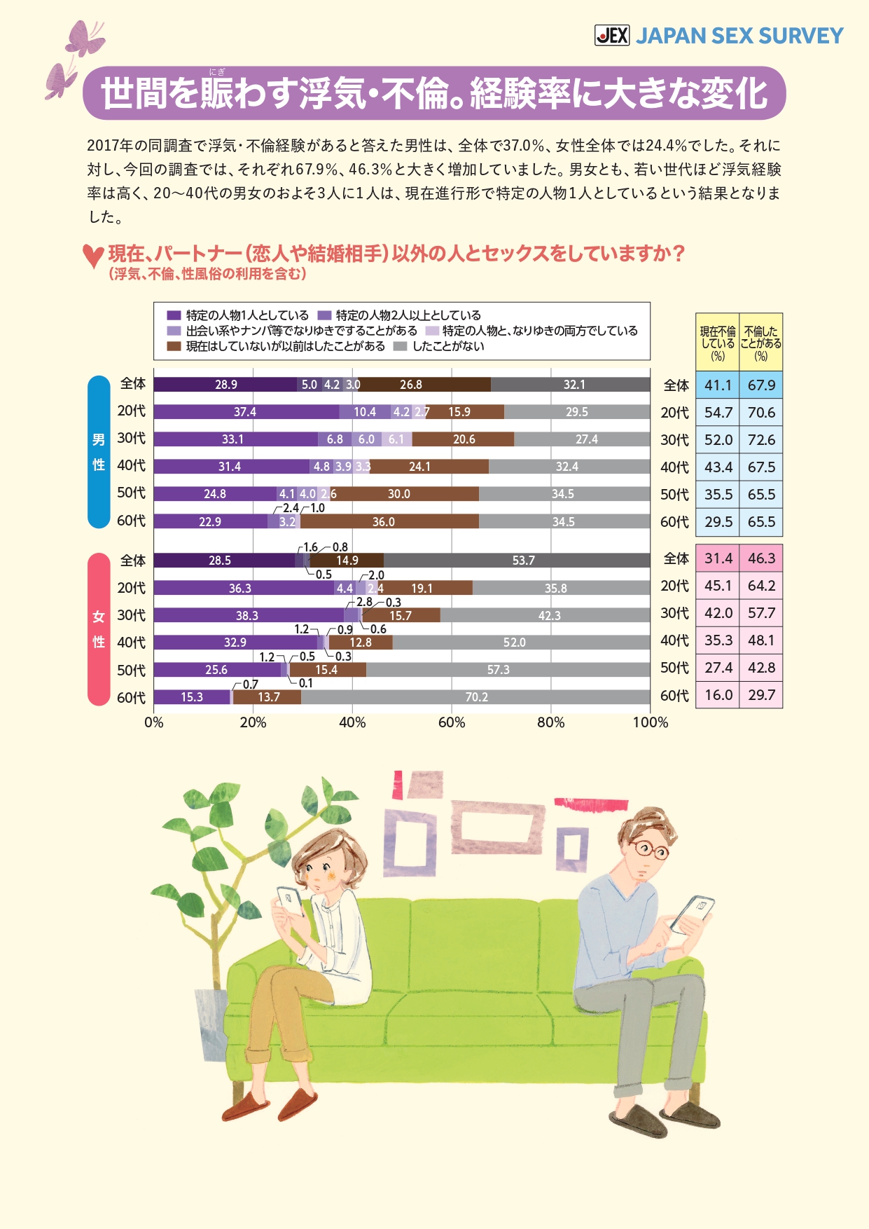根據日本性調查組織Japan Sex Survey(JPX)在2020年的統計,在20歲到30多歲的人之中,曾經有過外遇經驗的比例中男性超過了7成,女性也超過了6成,就算是從3年前,也就是2017年的調查來看,外遇的比例也占了過半數。每3個男性,就有2個有過外遇的經驗,每2個女性,就有一個有過外遇的經驗,以這樣的比例來看,也難怪這樣的說法會喧囂而上了。