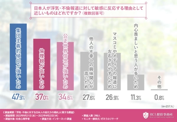 有一部分人認為,會造成這樣的情況,是因為有一部分社會人士因為壓力、或是自己曾經被外遇過導致的負面情緒,使得他們揮舞著名為正義的刀子大加抨擊。也有的人認為,這是因為日本人的集體意識以及倫理觀,導致他們容易跟著周遭的聲音一起批評,導致針對知名人士的外遇聲浪,遠比任何報導都還要來的高漲。