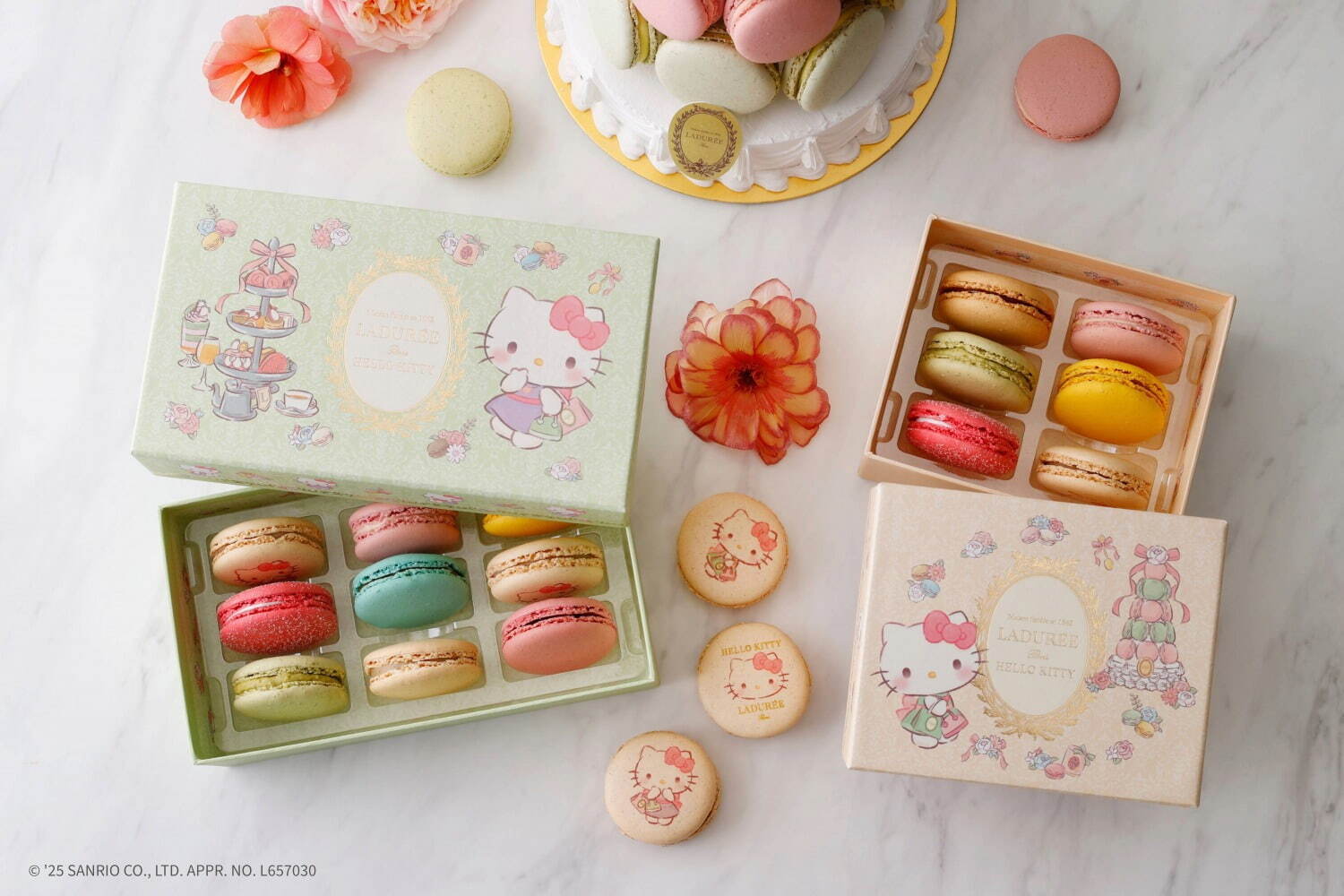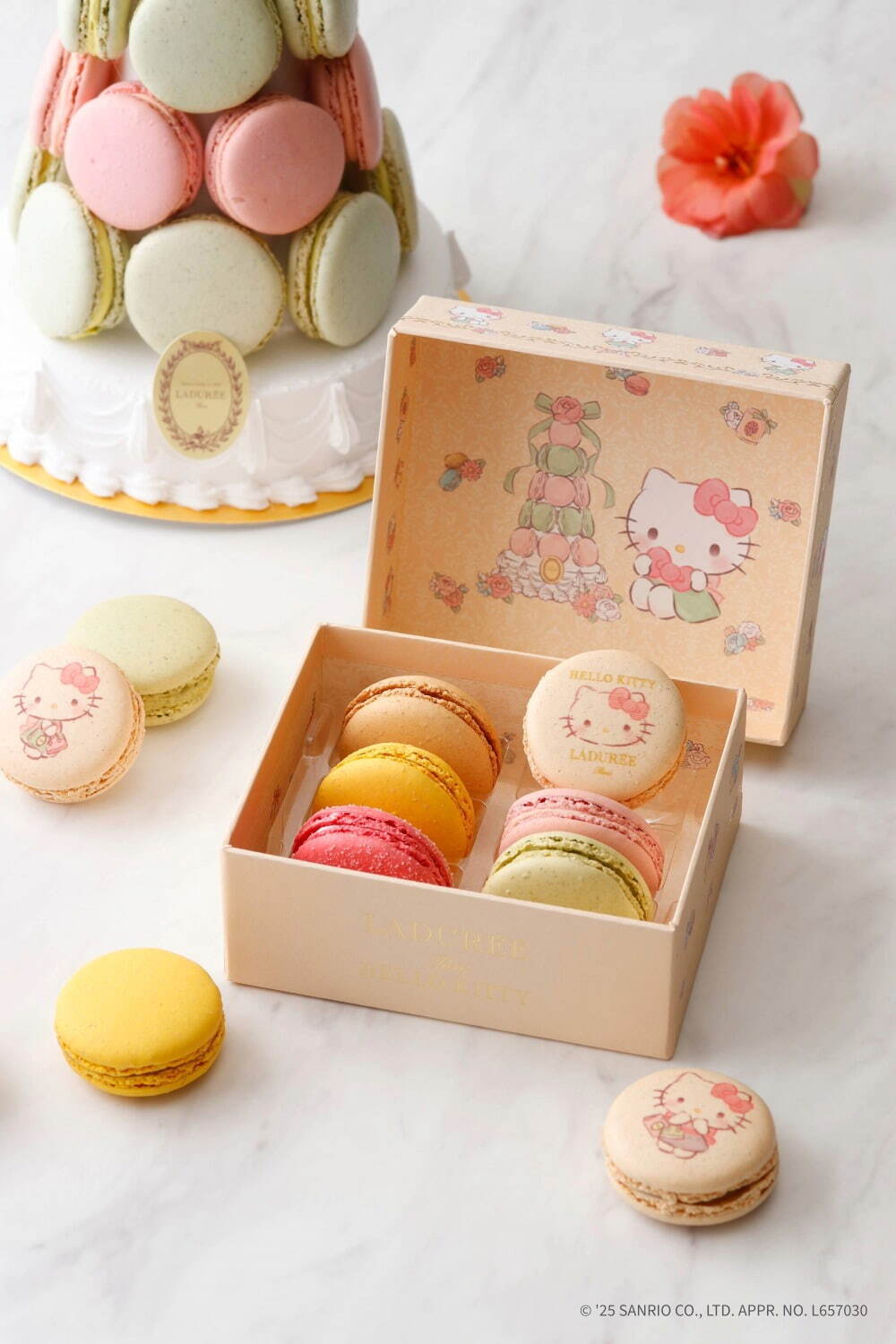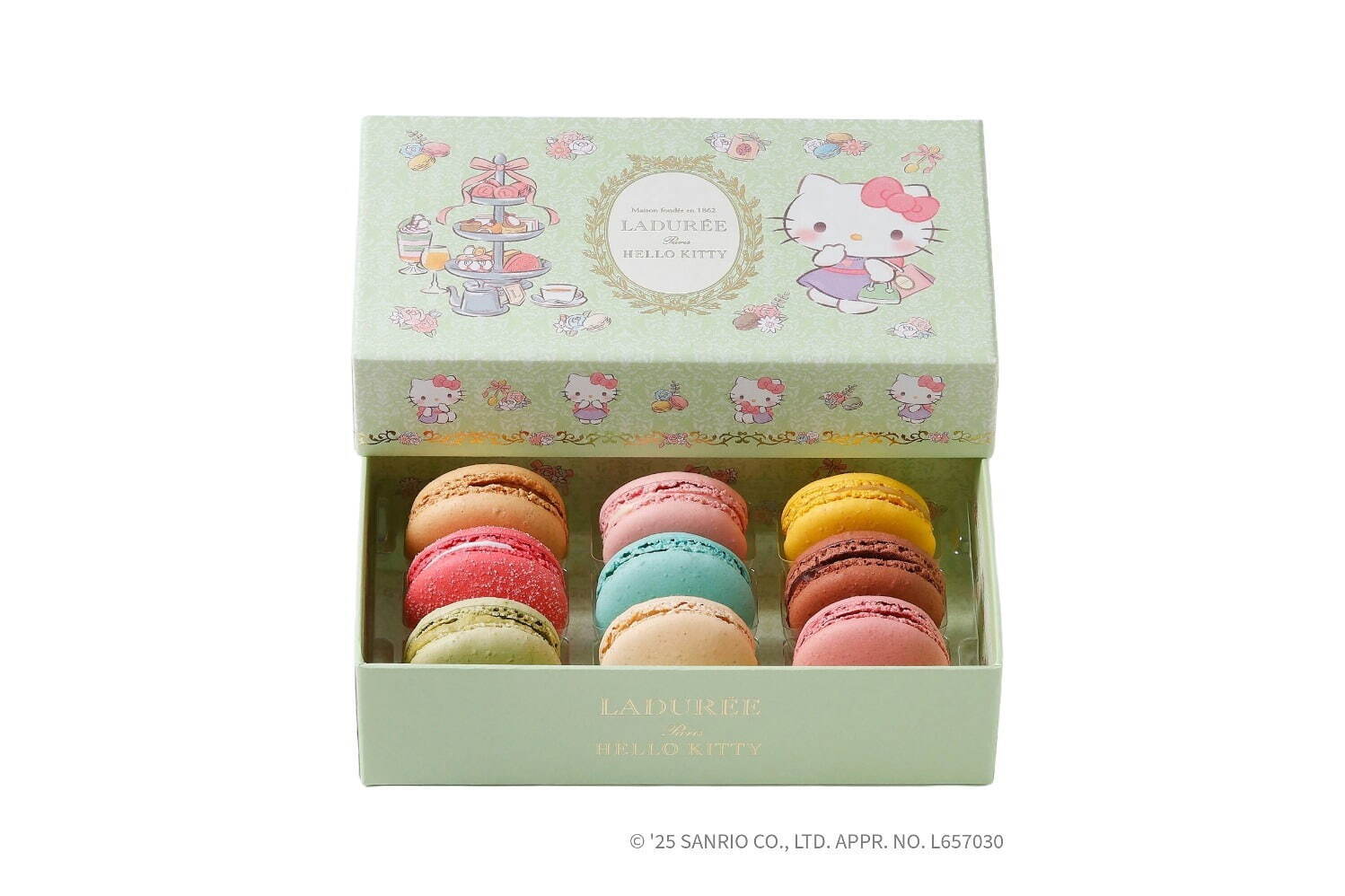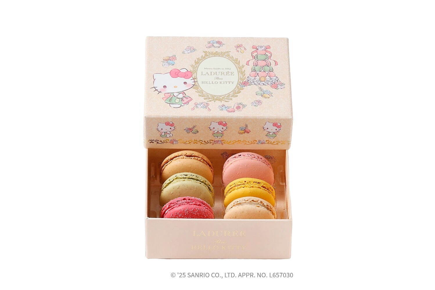 自2012年的首度合作以來,Ladurée與「HelloKitty」在時隔了13年後再度推出了聯名產品。這次的聯名系列以盛裝打扮的「HelloKitty」為主角,描繪出了她在精品店購物以及於法式茶點沙龍享用下午茶的可愛場景,打造出了十分可愛又夢幻感十足的馬卡龍禮盒。