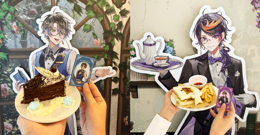 Ike 的文學氣息與優雅形象化身「墨水黑森林蛋糕」,深色外觀與醇厚的巧克力層次,搭配羽毛餅乾點綴,呼應作家的身份。「夜藍筆記氣泡飲」以代表色藍色為基調,檸檬的酸爽與氣泡的清新感象徵他的活力與熱情。咒術師Shu的餐點為「魔法焦香洋蔥雞肉三明治」,濃郁的洋蔥與嫩滑雞肉展現他的穩重特質,「解謎香蕉拿鐵」取材自他頭髮上的黃色元素,並結合牛奶的溫潤口感,完美詮釋他內心溫柔的一面。