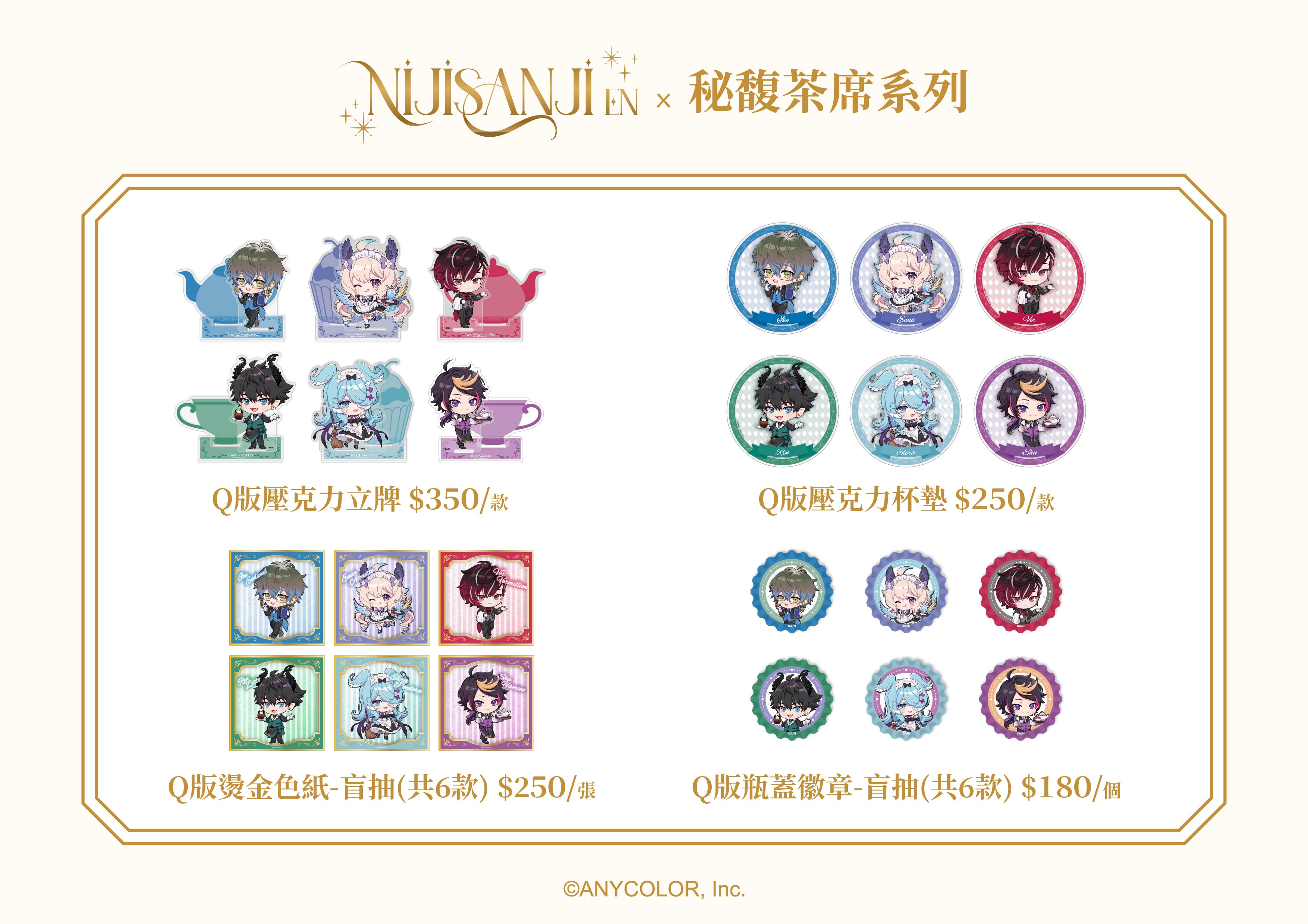除了原創主題餐點外,本次也有「FANFANS粉粉」獨家設計,由FANFANS 官網及CAFÉ限定預購販售的全新「秘馥茶席」系列周邊,立繪以及Q版繪圖為台灣首發限定款,一次收藏Liver們不同的嶄新樣貌!