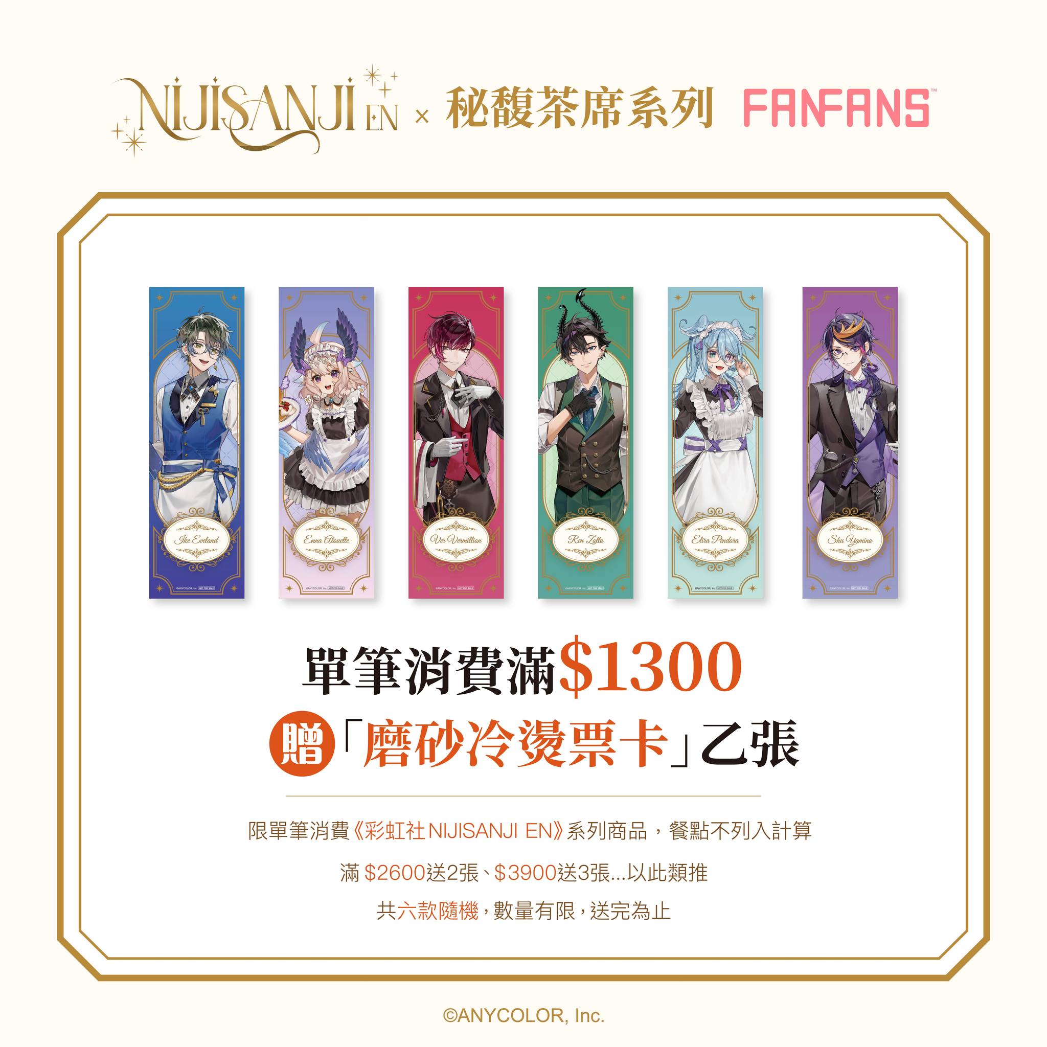 ■ 活動內容:現場或FANFANS粉粉官網購買《 彩虹社 NIJISANJI EN 》系列商品,單筆消費每滿1300元,就可以獲得限量「磨砂冷燙票卡」(共6款,隨機贈送),精緻質感完美呈現Liver們的迷人樣貌,更作為書籤使用!