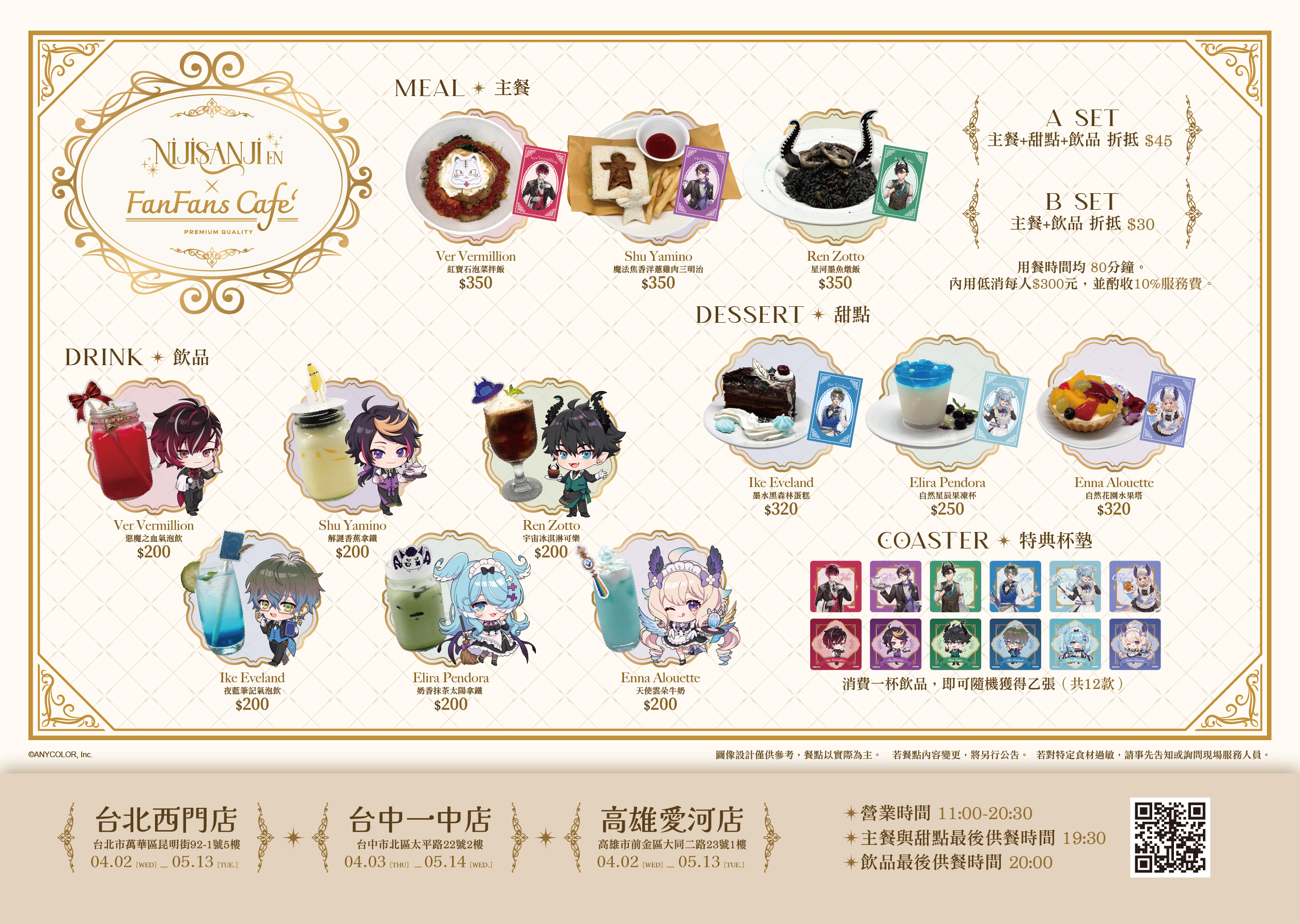 全球人氣 VTuber 事務所「彩虹社」即將在台灣掀起全新旋風!本次由NIJISANJI EN旗下的六位人氣Livers—Ver Vermillion、Shu Yamino、Ren Zotto、Ike Eveland、Enna Alouette、Elira Pendora,與正版授權品牌 FANFANS粉粉的主題咖啡廳 FANFANS CAFÉ 攜手推出快閃主題咖啡廳「《 彩虹社 NIJISANJI EN 》主題聯名咖啡廳 @ FANFANS CAFÉ」,2025年4月2日起各別於台北西門、台中一中、高雄愛河以及泰國分店正式登場!