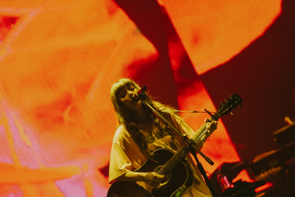 轉調後,燈光瞬切至黃橙搭配白光的暖色系,身穿黃色T恤與黑花褲的愛繆登場!一開口就是清唱,嘹亮的歌聲響徹全場,以〈反正都要死〉揭開這場既可愛又迷人的演唱會序幕。