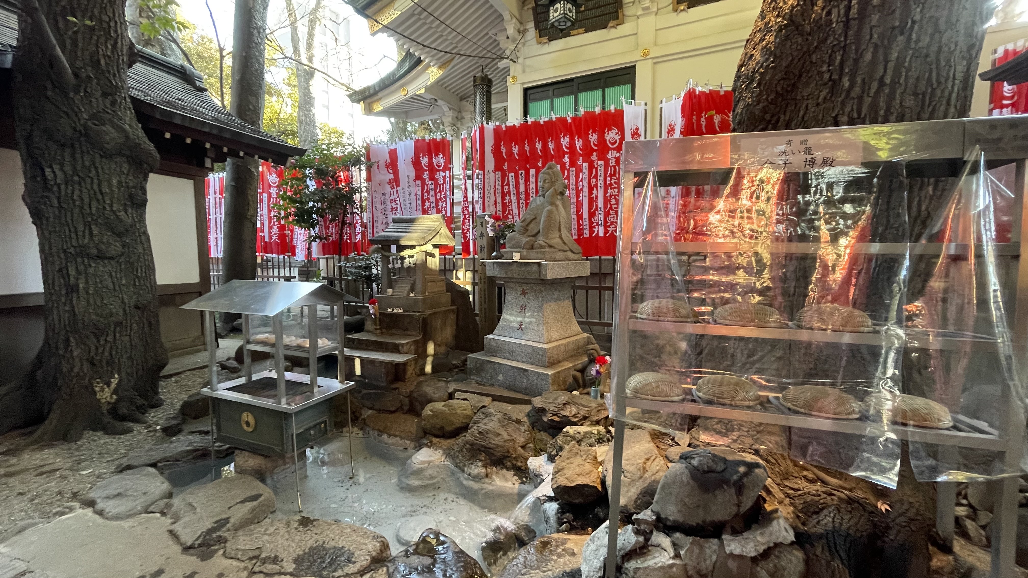 在豐川稻荷的境內,也供奉著七福神中唯一的女神「弁財天」走到本殿面向左側的小岩石上,就可以看到供奉的弁財天像。前方設有小小的水池與可以放置錢幣的竹籃,將硬幣或紙鈔以淨水清洗,象徵洗去厄運與穢氣,祈願金運提升、財運亨通。