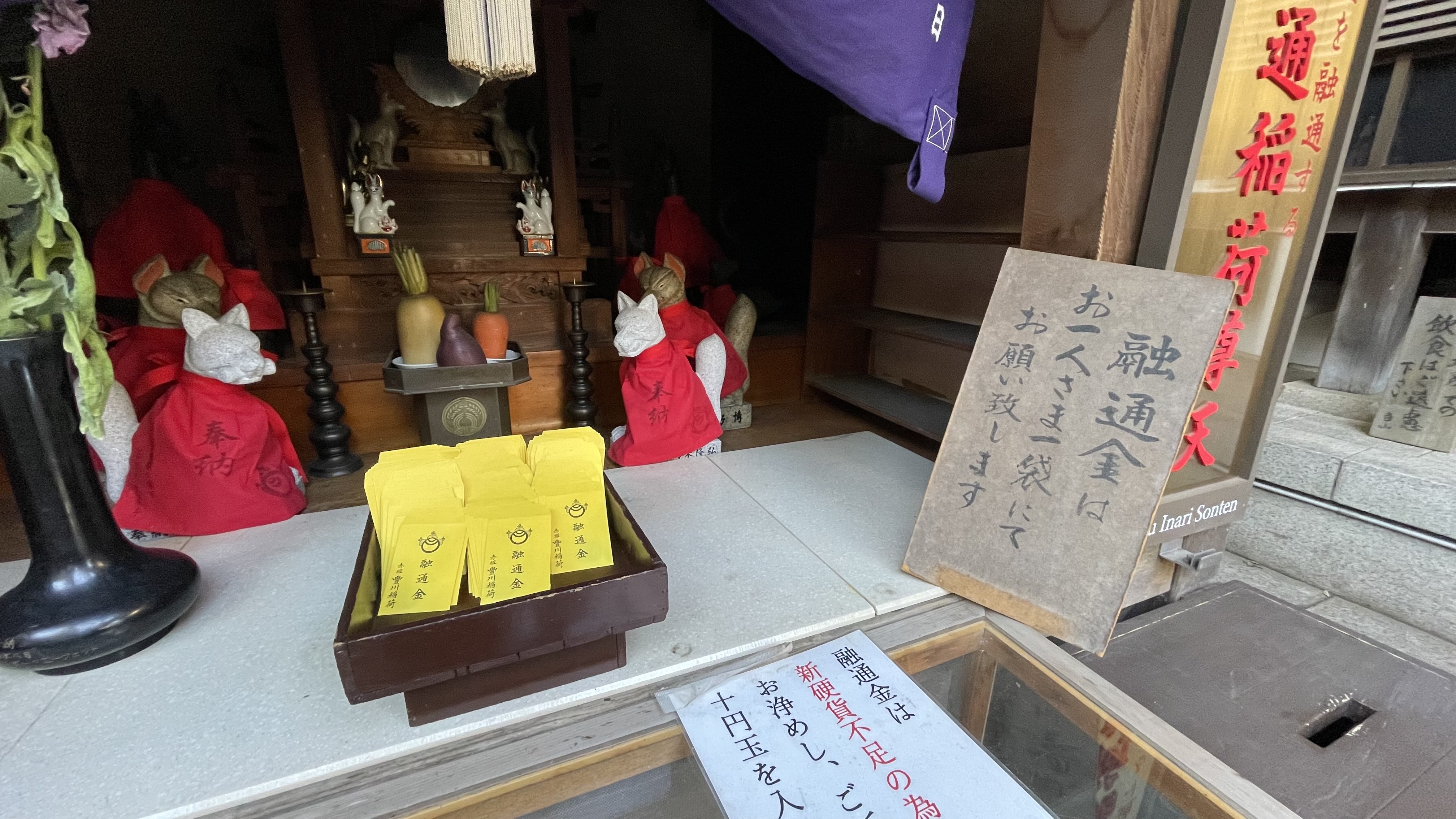 融通稻荷供奉的是能帶來財寶的尊貴天神,正式名稱為「南無融通寶生尊天」。傳說只要大家真心誠意地參拜信仰,就能實現金運財運的願望。可以向神明祈求融資金,也就是所謂的發財金,但也要記得前來返還喔。