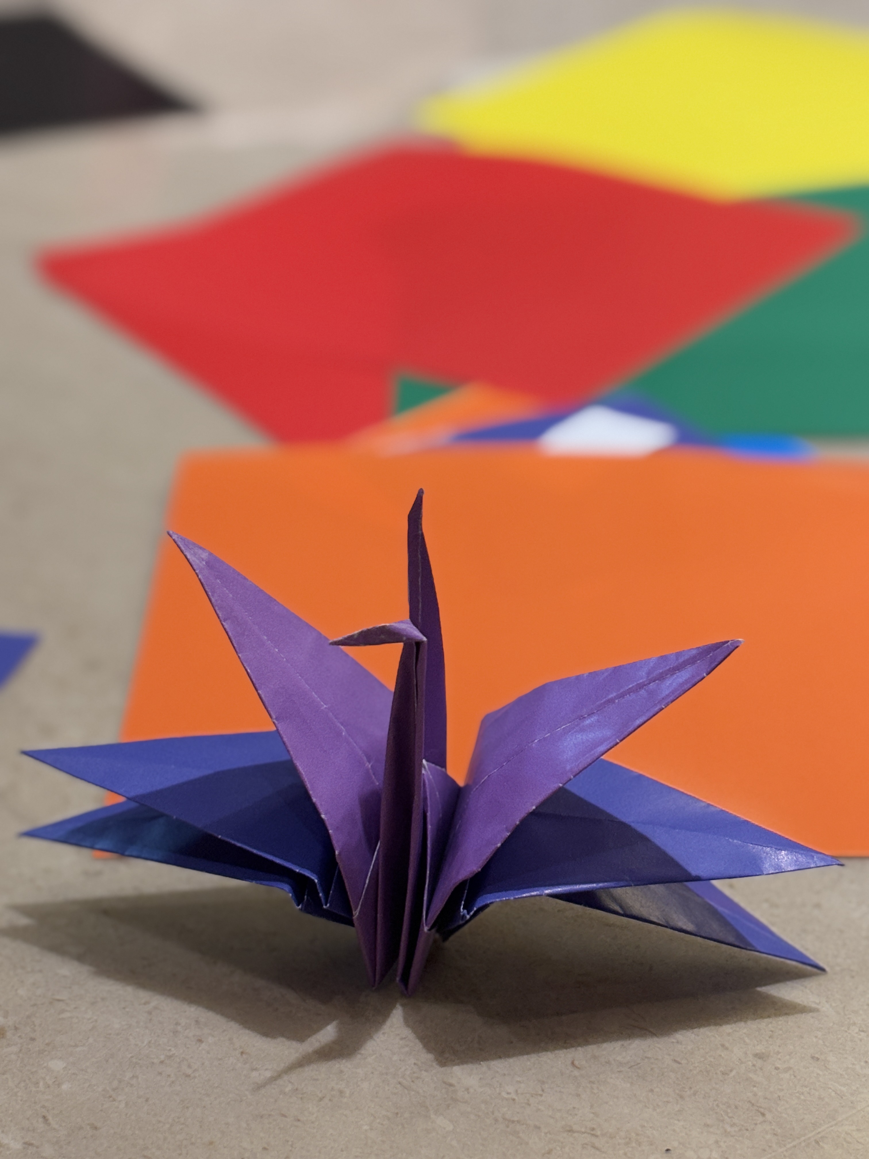 來台後,她有時也會獨自折紙鶴,「折鶴的過程讓我感到內心很平靜,不知不覺就折了好多隻。」在和台灣同學的文化交流活動中,她也會教大家怎麼折紙鶴,延續與傳承這項日本傳統文化。她展示了最近折的一隻創意紙鶴——擁有許多翅膀的特殊設計,非常有創意。