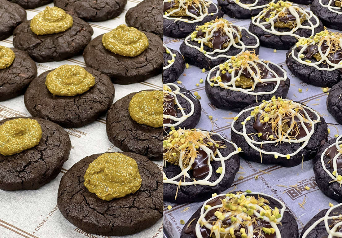 像是這道「杜拜餅乾」(ドバイクッキー),在濃厚的巧克力餅乾上,擠上一整團與杜拜巧克力內餡相同的開心果脆脆內餡,能品嘗到香濃的開心果滋味。