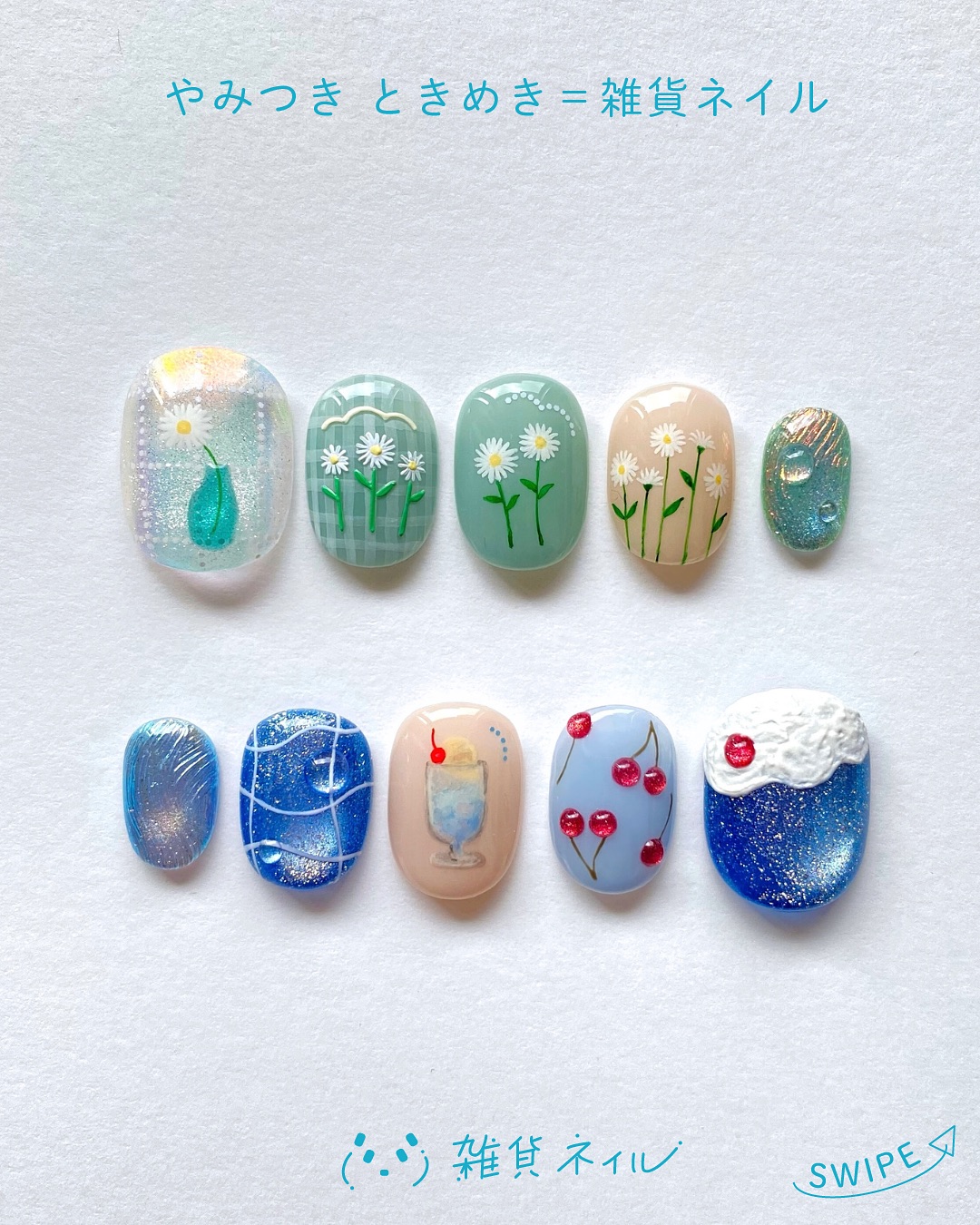 給人濃濃夏日氛圍的果實指彩,運用和風的沁涼飲品為主題,在指尖上繪畫冰淇淋蘇打汽水看起來超清涼降溫,融入果實、花卉等元素,使手部細節增添滿分的季節魅力,或者透過冰塊等風格聯想,結合寶石、水鑽點綴,連結品味質感凸顯的特色層次。