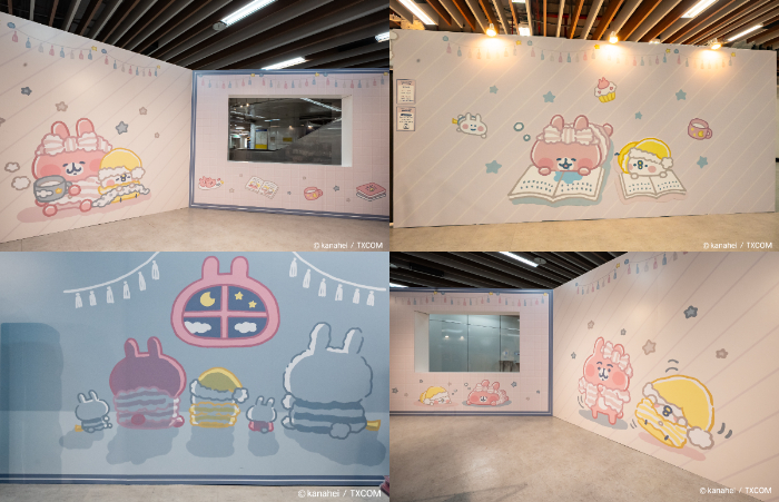 一到門口就看到「主視覺」上P助與粉紅兔兔已經換上睡衣準備好迎接大家啦!想知道P助怎麼讓粉紅兔兔一秒入睡嗎?看看旁邊「睡前晚安故事」就知道,粉紅兔兔已經聽到口水流滿書啦!店內左側「不想睡五連拍」滿滿都是P助和粉紅兔兔超萌睡姿,怎能不拍好拍滿?想來杯「熱熱晚安茶」嗎?P助已秒睡,粉紅兔兔還悠閒地喝著熱茶,又或是跟著粉紅兔兔做做「好眠扭扭體操」?還是睡前要來場「星空派對開起來」,跟著P助與粉紅兔兔玩桌遊、照鏡子打扮一番。店裡角落「窗前看月亮」超療癒背影,也別忘了到P助與粉紅兔兔抱巨型玩偶的「好夢連連巨型扭蛋區」來試試你的好手氣,最後,店外超過15米的「卡娜赫拉的小動物拍照牆」也別錯過嚕!