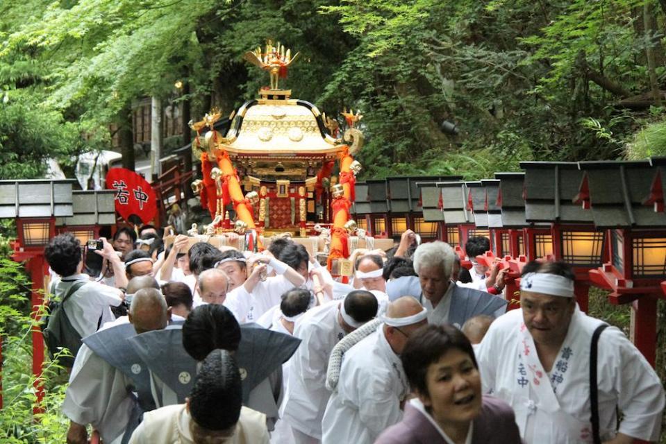 在祭典的下午左右,會由一群白衣的壯丁們抬著神轎恭迎「高龗神」,並朝著奧宮的方向巡視,除了盛大的遊行隊伍外,周遭的部分店家也會擊鼓助陣,好不熱鬧。在高龗神巡視結束後,再由出雲神樂奉納為整場祭典做收尾,這樣盛大的傳統祭典,是你不會後悔參加的好選擇。