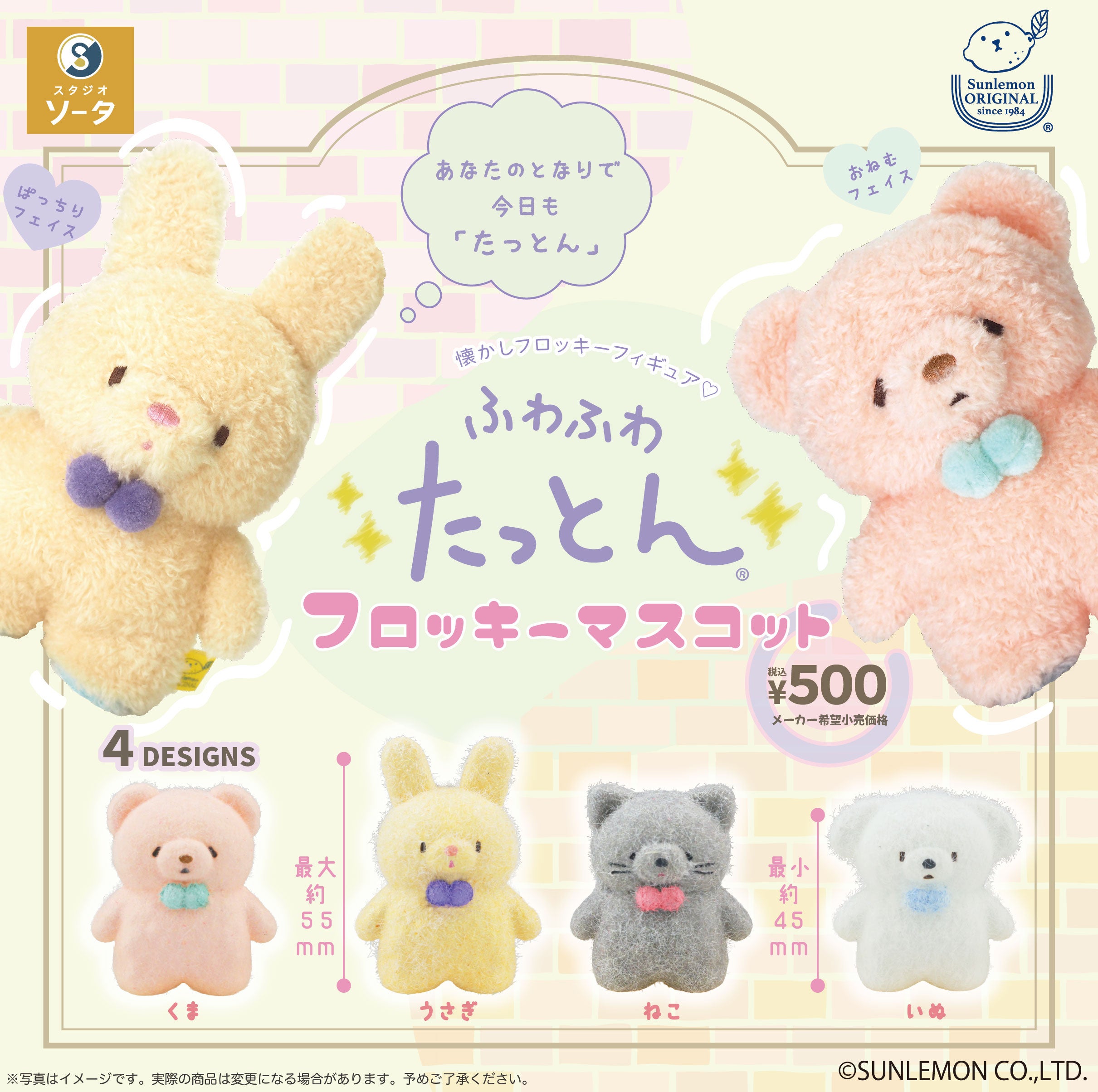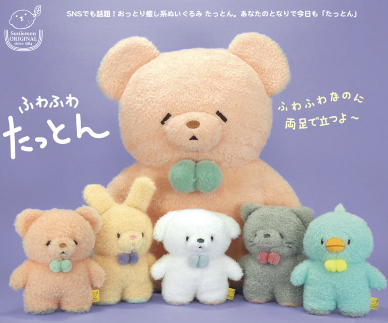 「ふわふわたっとん」是由專門製造玩偶雜貨的公司「sunlemon」(サンレモン)所推出的療癒玩偶系列,該系列玩偶以「可直接站立」為設計亮點,並推出許多動物造型,包含熊熊、兔子、貓咪、狗狗等可愛動物,甚至還有河童、雪人、幽靈、雷公等有趣的角色,角色不但多元,還分成大(L)、中(M)、小(S)等各個不同的尺寸,滿足喜歡療癒玩偶粉絲的收集慾。