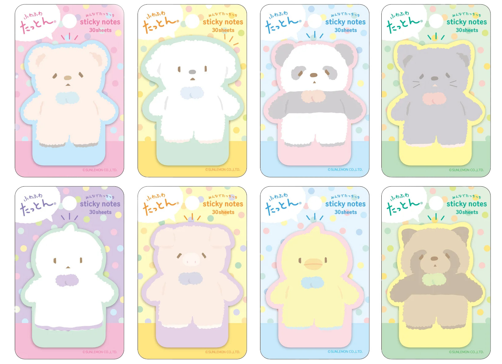 而ふわふわたっとん這系列可站立娃娃也在近期與文具廠商合作,推出造型便條紙。將娃娃的可愛模樣直接變成便條紙,並沿用娃娃的「可站立」設計,將便條紙也設計成「可立式」,不只便條紙本可直接立於辦公桌/書桌上,就連將便條紙一張一張取下時,也能讓便條紙立起來,放在桌上既可愛療癒,又能讓人一眼看到,不錯過任何人留下的memo訊息。
