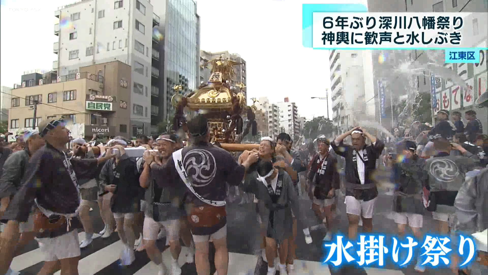 在巡遊的時候,沿途的觀眾與遊客會朝著神轎的抬轎者潑灑大量清水,象徵著淨化與助威,使得深川八幡祭又有著「潑水祭」的別稱。伴隨著抬轎者的吶喊以及四濺的水花,讓觀眾們能夠與現場的氣氛融為一體,共同享受這場祭典的熱情,是一場體感十足的都市型傳統祭典。