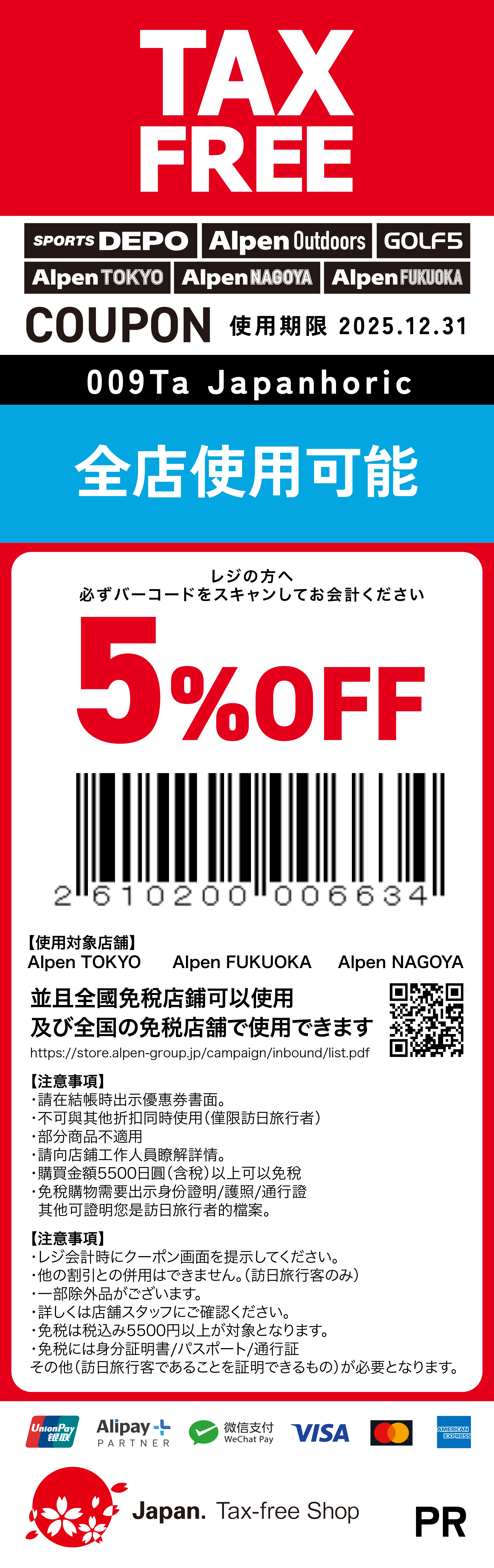 使用觀光客限定的優惠券,就能享受免稅,再享95折優惠!