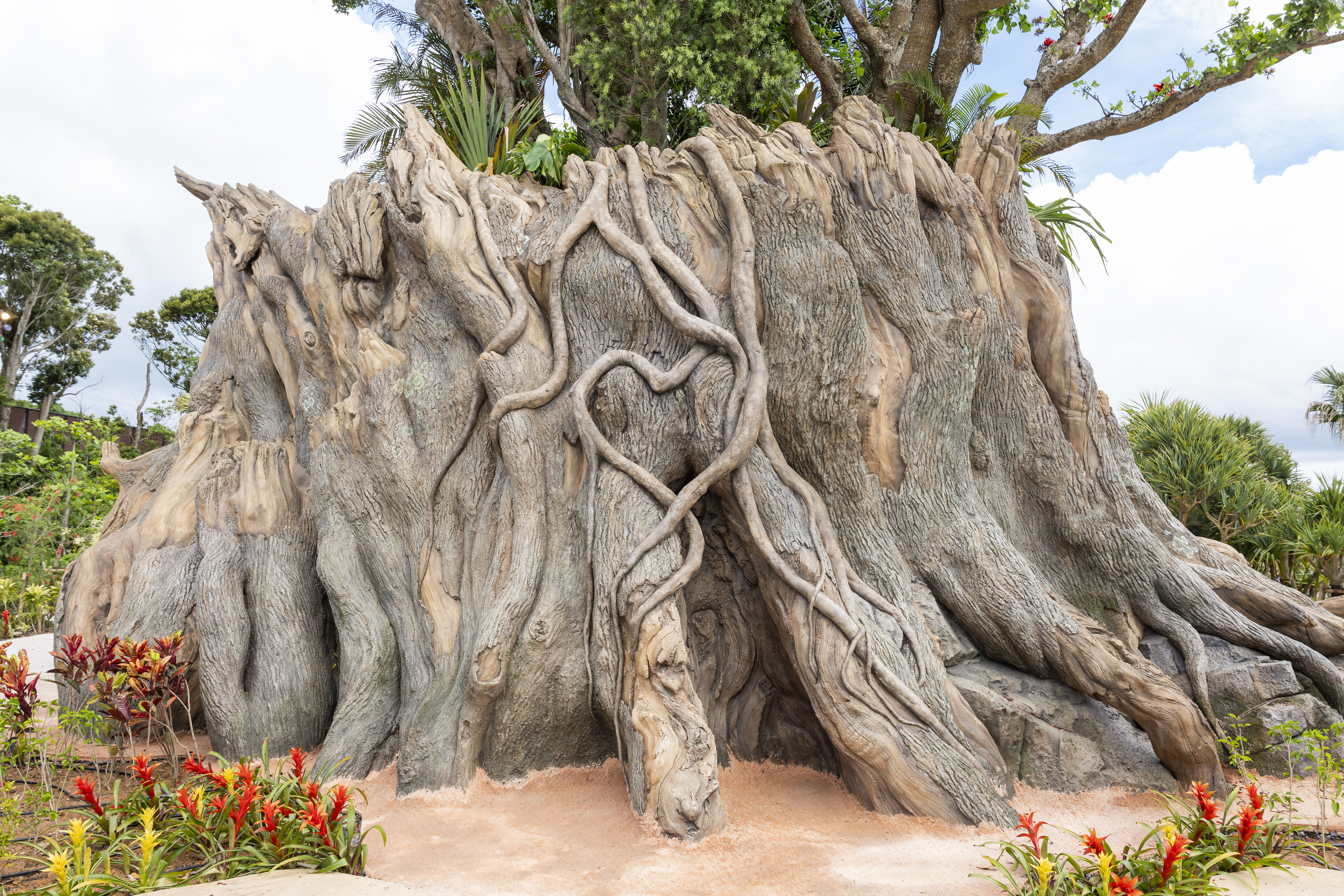 走過園區入口小徑後,映入眼簾的是高聳壯觀的象徵性建築——JUNGLIA TREE(ジャングリア ツリー)。這座全長14.5公尺、直徑12公尺的巨樹,是將沖繩各地代表性樹木集結而成的「活著的地標」,是每位訪客踏入園區後最初的沉浸式體驗。