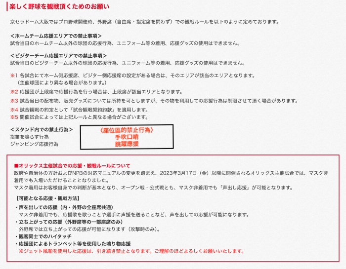 但其實不單只有演唱會,觀看球賽時也同樣不能在場內跳動。根據大阪京瓷巨蛋官網的觀戰守則,球場的座位區除了「禁止手吹口哨」,也明確發表「禁止跳躍應援」的規定。習慣在這裡看棒球的粉絲已經習以為常了,反而不太會引起話題。