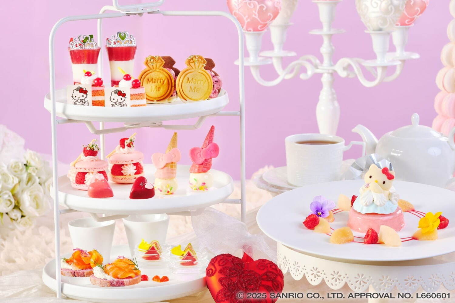 此外,還有以戒指盒為靈感設計的巧克力以及裝飾有公主風格Hello Kitty的小蛋糕等,每一款甜點都充滿巧思。餐點及飲料也是以柔和的粉紅與紅色為基調,營造可愛甜蜜的氛圍。