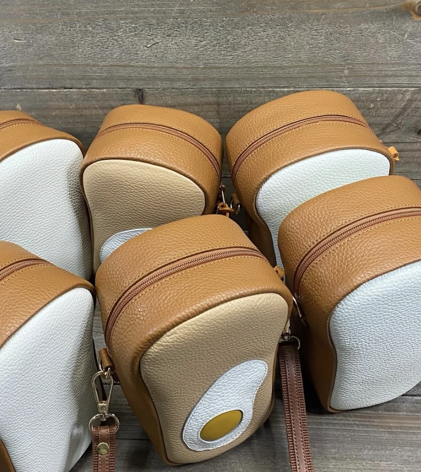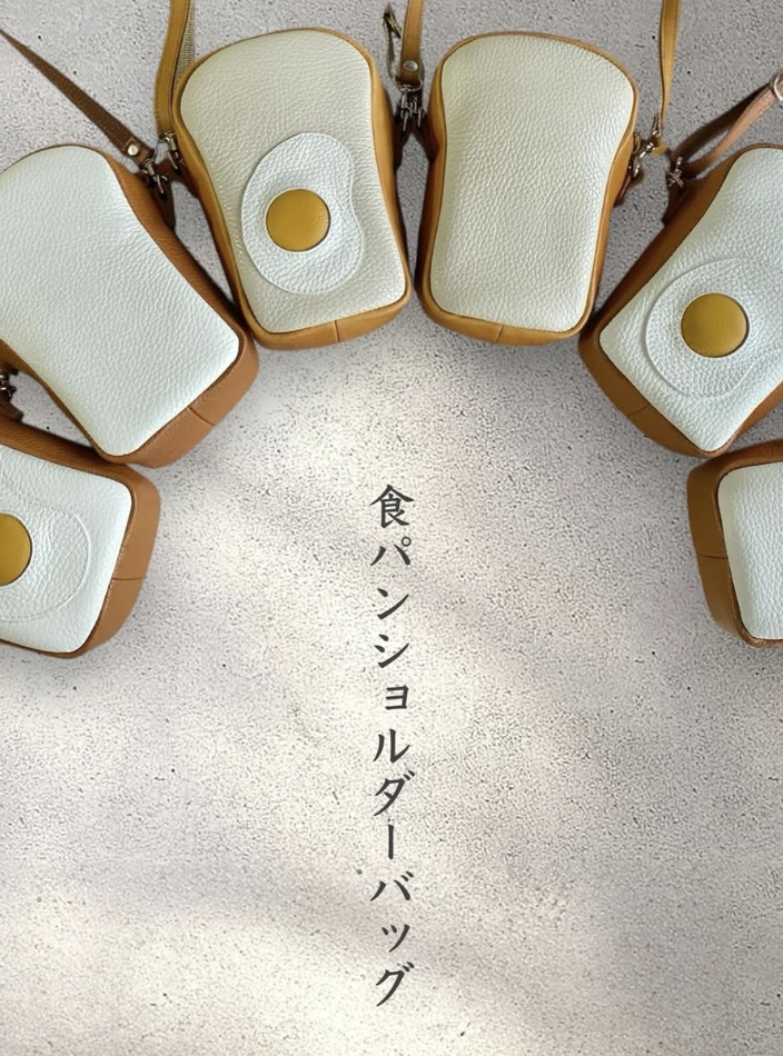 在Leather.Bread 的包款當中,最經典熱銷的就是吐司造型側背包(食パンショルダーバッグ),一共有兩種造型:白吐司、加蛋吐司。包款的大小適合拿來放手機、鑰匙、卡夾等隨身用品,背在身上超級吸睛。