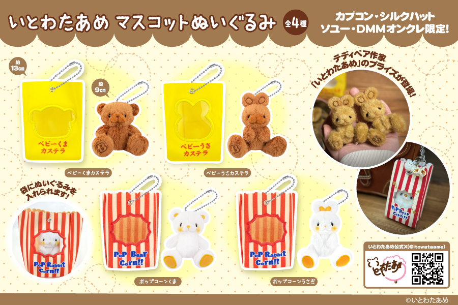 而在いとわたあめ的泰迪熊作品之中,最受關注的便是以布製娃包配上手作泰迪熊的吊飾組合,這個吊飾組合最初的造型是以卡斯特拉/長崎蛋糕為設計而誕生,而後又推出了蜂蜜卡斯特拉、爆米花等食物題材的設計。