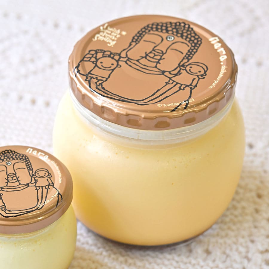 蓋子上印有可愛大佛插圖的「Mahoroba大佛布丁(まほろば大仏プリン)」是奈良的人氣伴手禮之一,分為大瓶與小瓶兩種口感:大瓶較為紮實,小瓶則綿密滑順。口味選擇豐富,從經典卡士達到大和茶、巧克力、乳酪等應有盡有。使用高品質鮮奶油製成,風味濃郁香醇,入口如絲滑般柔順。可愛的大佛玻璃瓶還能作為小物收納盒重複利用。由於屬於生菓子,不僅需冷藏,保存期限也僅有三日,購買時請留意保存方式。