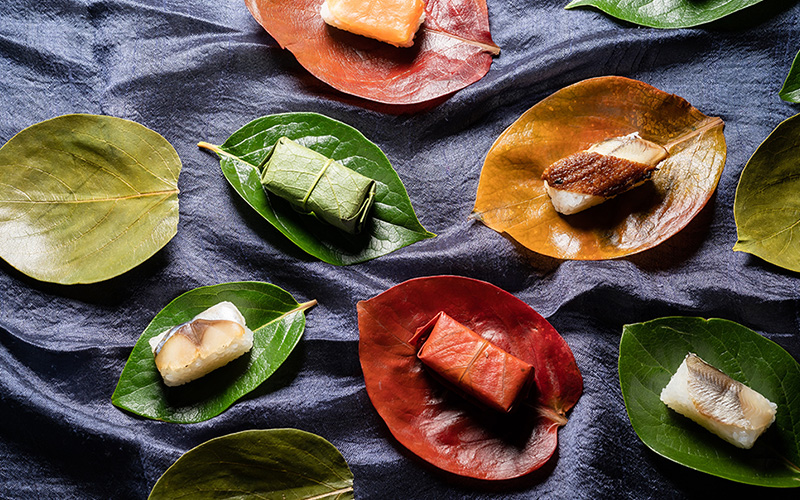 柿葉壽司(柿の葉ずし)是奈良代表性的鄉土料理,以鹽醃鯖魚搭配醋飯,再以具有防腐效果的柿子葉包裹製成,不僅能延長保存時間,靜置一天後風味也會更加融合,是其獨特魅力之一。關於柿葉壽司的起源,說法眾多,但普遍認為是因奈良地處內陸、距離海岸遙遠,古人為了保存珍貴的海產,才發展出「以鹽醃漬、以柿葉包裹避免乾燥」的製作方式,並傳承至今,成為今日奈良最具代表性的美食之一。除了經典的鯖魚外,還有鮭魚、金目鯛、星鰻等多種口味可選,滿足不同喜好。柿葉的清香會逐漸滲入壽司中,帶來淡雅風味。