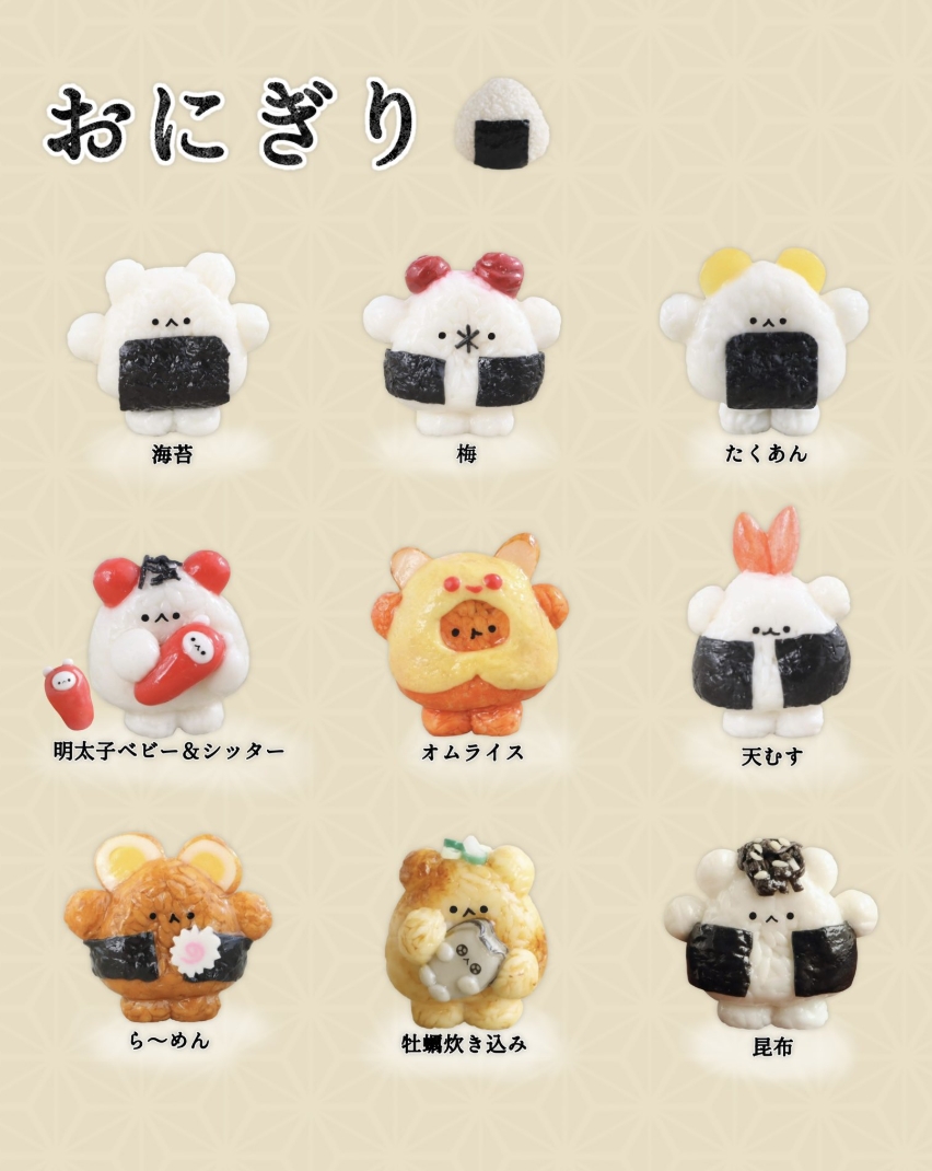 首先要介紹的是飯糰系列,這系列就叫做「おにぎり」(飯糰),雖然作者並沒有明言是以什麼動物為原型,但可以發現每個飯糰都有著狀似熊的耳朵,外型則依照飯糰口味而有所不同。