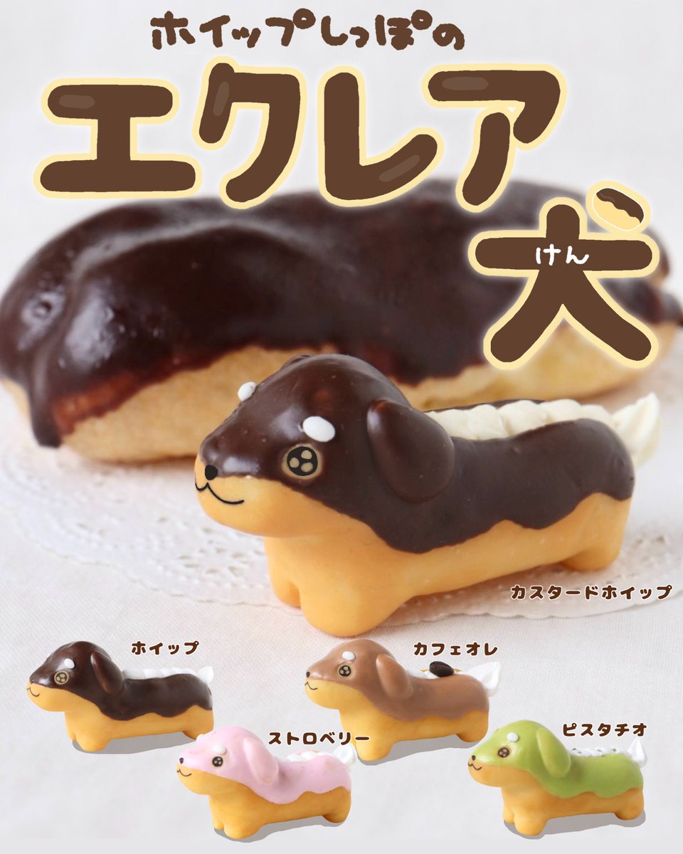 再來是身軀為閃電泡芙的「エクレア犬」系列(暫譯:閃電泡芙狗狗),相信大家應該都有吃過閃電泡芙吧?長型的閃電泡芙直接變成狗狗的身體,除了裹著巧克力糖衣的基本款,甚至還有草莓巧克力糖衣、咖啡歐蕾糖衣、開心果糖衣等不同的口味款式,看起來既美味又可愛。