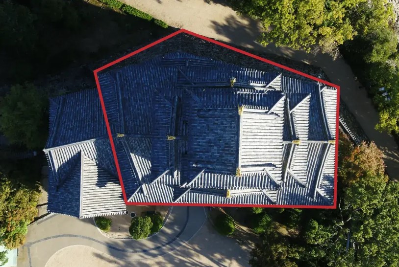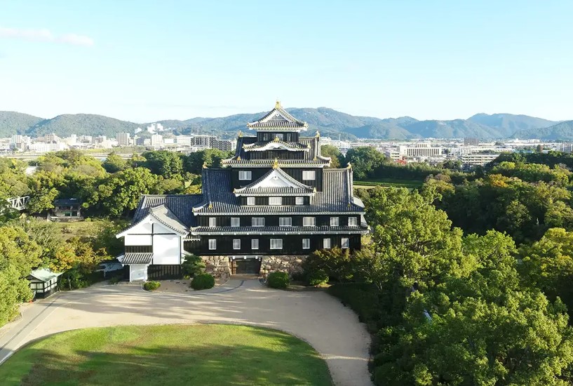 岡山城是日本著名的歷史名城,由豐臣秀吉家臣宇喜多秀家於慶長2年(1597年)建造完成。因其外牆以黑色下見板覆蓋,外觀沉穩莊重,故有「烏城」之稱,亦因出土的金箔瓦而被稱為「金烏城」,象徵當時宇喜多家作為豐臣政權重臣的地位與威嚴。天守台為全國罕見的不等邊五角形設計,據說是因順應岡山丘陵地形所致,天守西側還附有鹽藏作為防禦與儲藏用途。