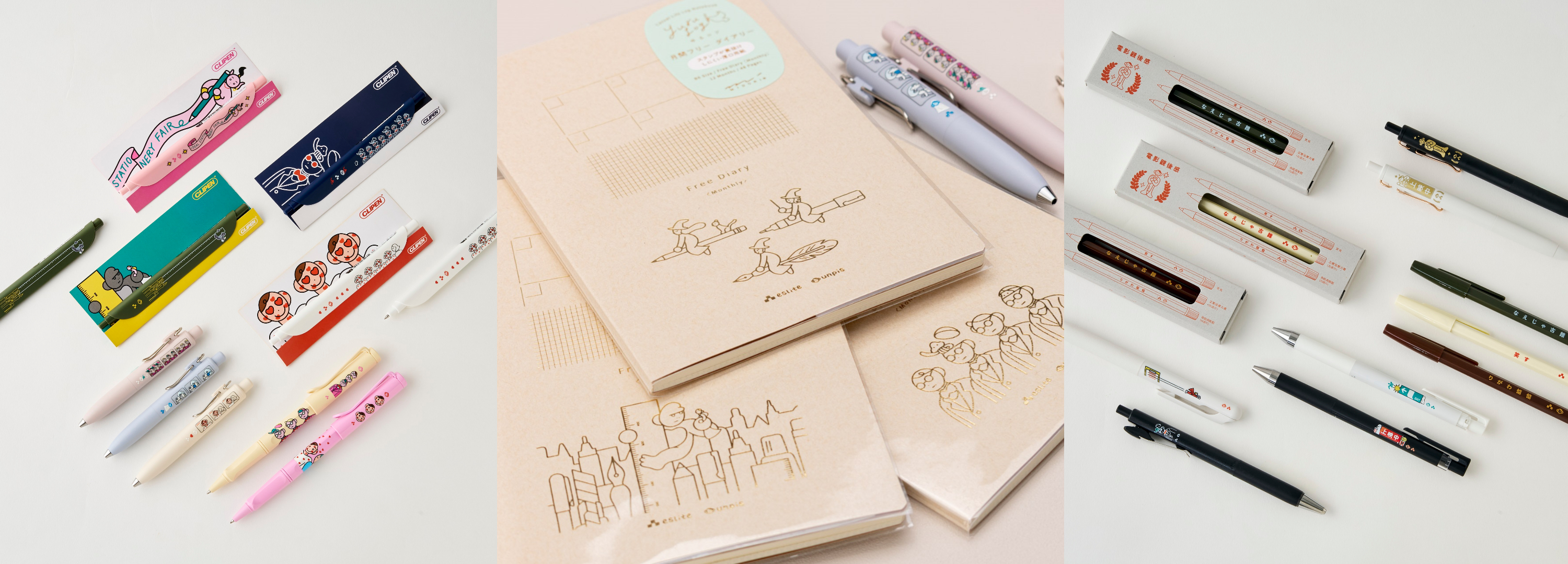 文具迷最愛、超過20大品牌聯名夢幻連動!unpis獨家設計的「文具大影業」視覺除了登上日本紙品專家MIDORI、風格手帳品牌MARK’S、德國百年紙業LEUCHTTURM1917以及英國鬼才設計師Paul Smith都愛不釋手的法國RHODIA筆記本,可愛電影角色也一舉躍上德國頂級工藝LAMY safari 鋼珠筆、快乾不卡墨的筆記神器uni-ball one鋼珠筆,就連台灣最熟悉的原子筆代表SKB也幽默結合台語和日語,創造超搞笑電影觀後感,如「笑す=笑死」、「りがわ惦惦=你給我惦惦」,替不知道如何表達內心感受的你說出真實心聲。