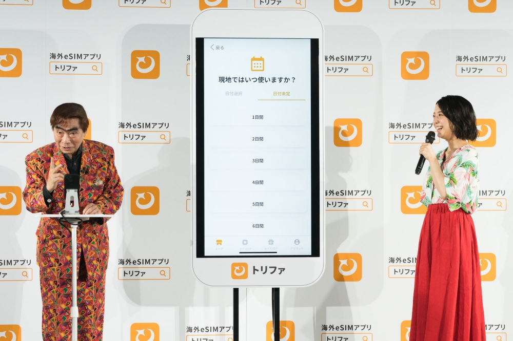 除此之外,在廣告中為美洲神祕生物「卓柏卡布拉」配音的聲優「我修院達也」也驚喜現身發表會。上白石萌音也在現場熱心教學我修院達也如何使用trifa。我修院達也在實際操作過程中,對於eSIM的親民價格感到驚訝,並直呼真的很方便,連身為高齡者今年75歲的他也可以輕鬆購買。