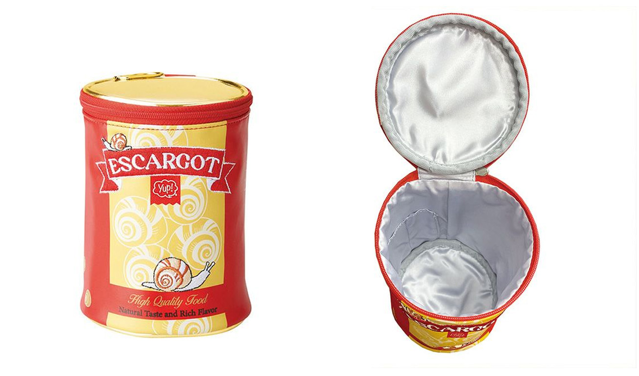 以食品罐頭包裝為造型設計而製成的收納包,從罐頭的形狀、罐頭上蓋的易開罐拉環設計,甚至是罐頭的包裝圖樣等地方,都仿造「真」罐頭的設計去製作,可說是細節感滿滿。而這款造型則是非常有特色的罐頭料理「法式田螺肉(蝸牛肉)」。