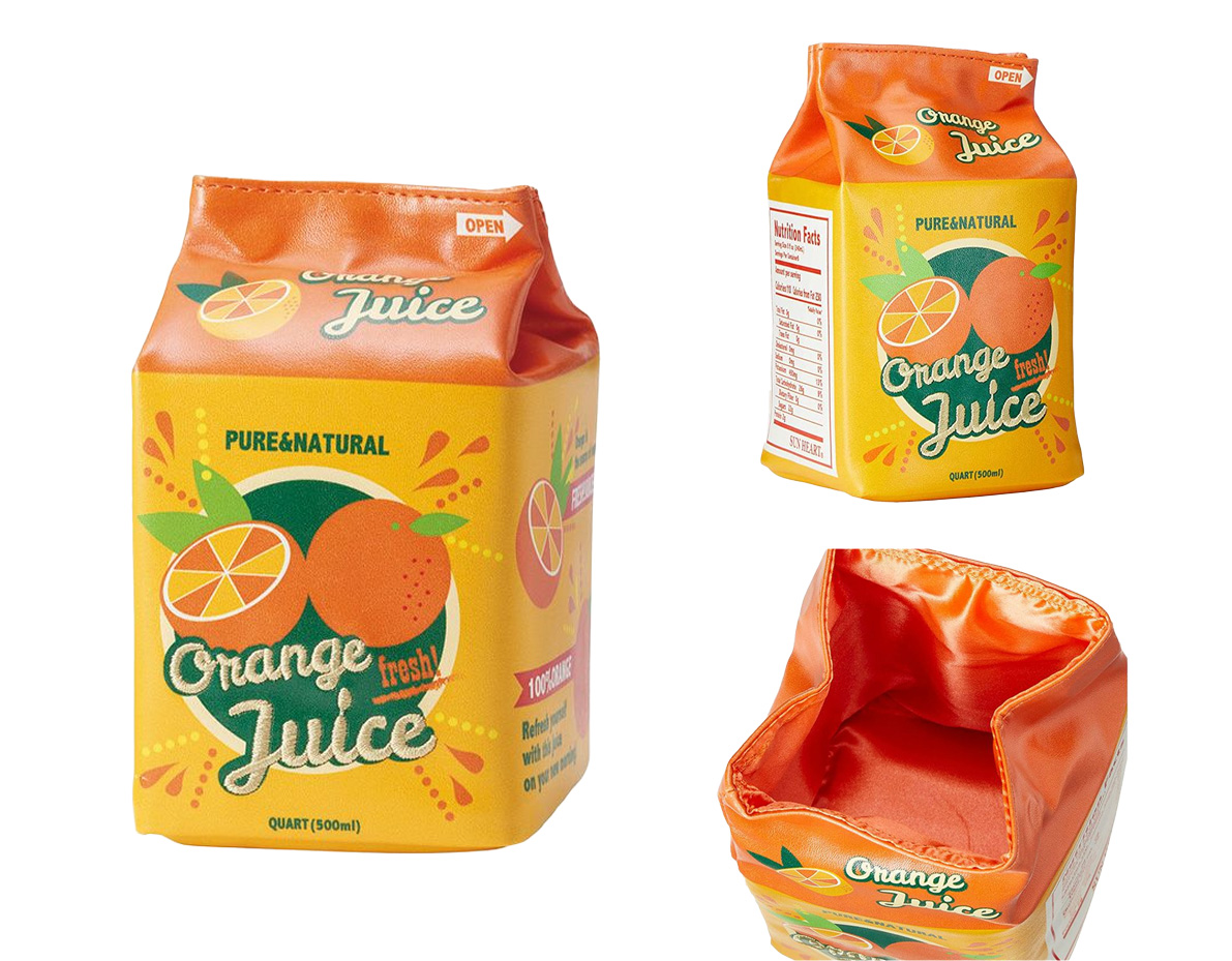 同樣以食品包裝為設計的還有這款商品,是市面上常見的飲料利樂包造型,就連打開收納包的方式都跟利樂包的開盒方式相同;如果仔細觀察收納包外觀設計的話,還會發現就連柳橙汁的成分表都有印在上面,細節上可說是相當還原。