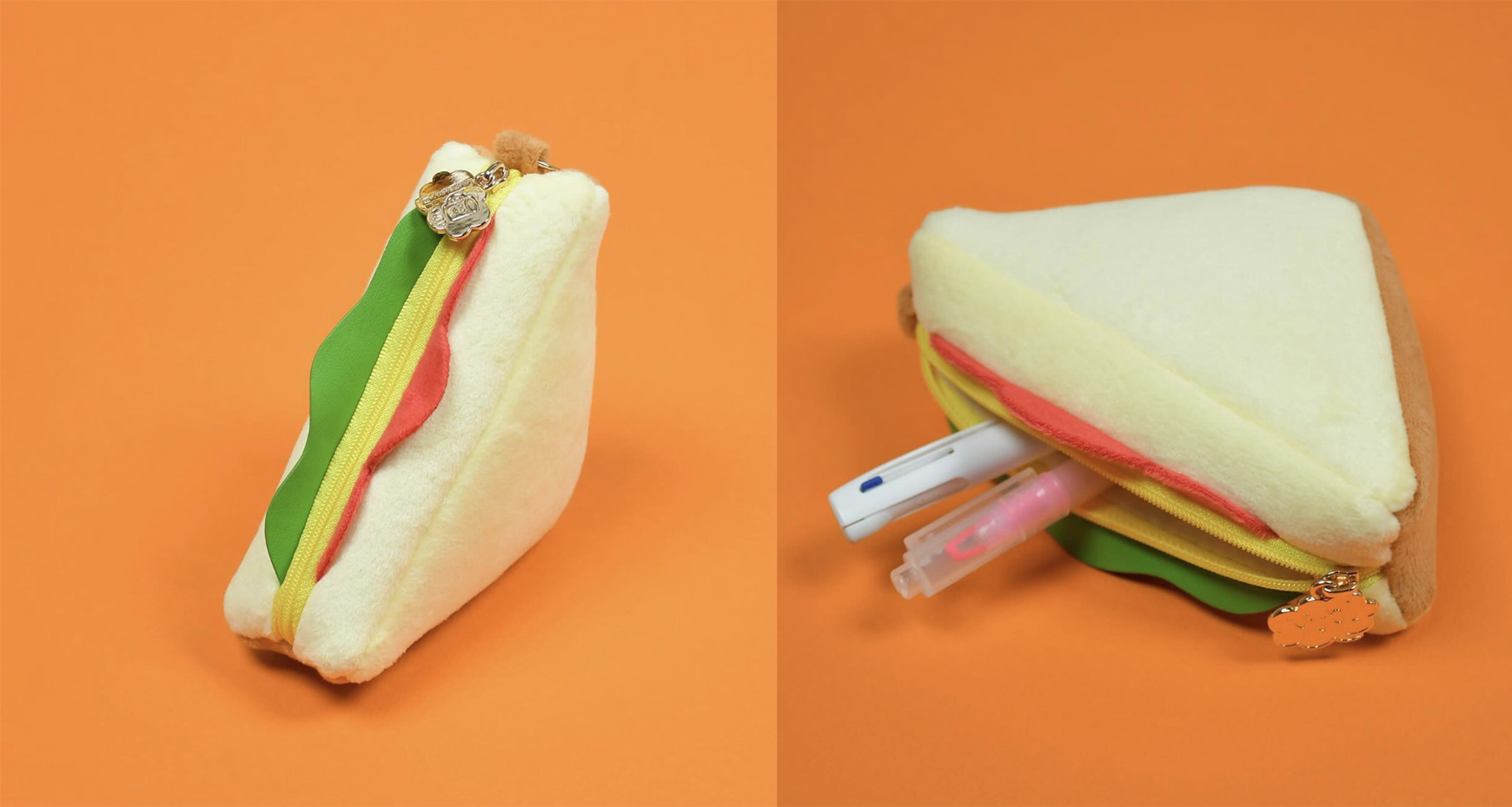 三明治造型收納包不只是外型吸睛,更有趣的是,收納包開口是做在三明治夾心正中間,當打開拉鍊時,就像是把三明治剖半一樣,十分幽默。