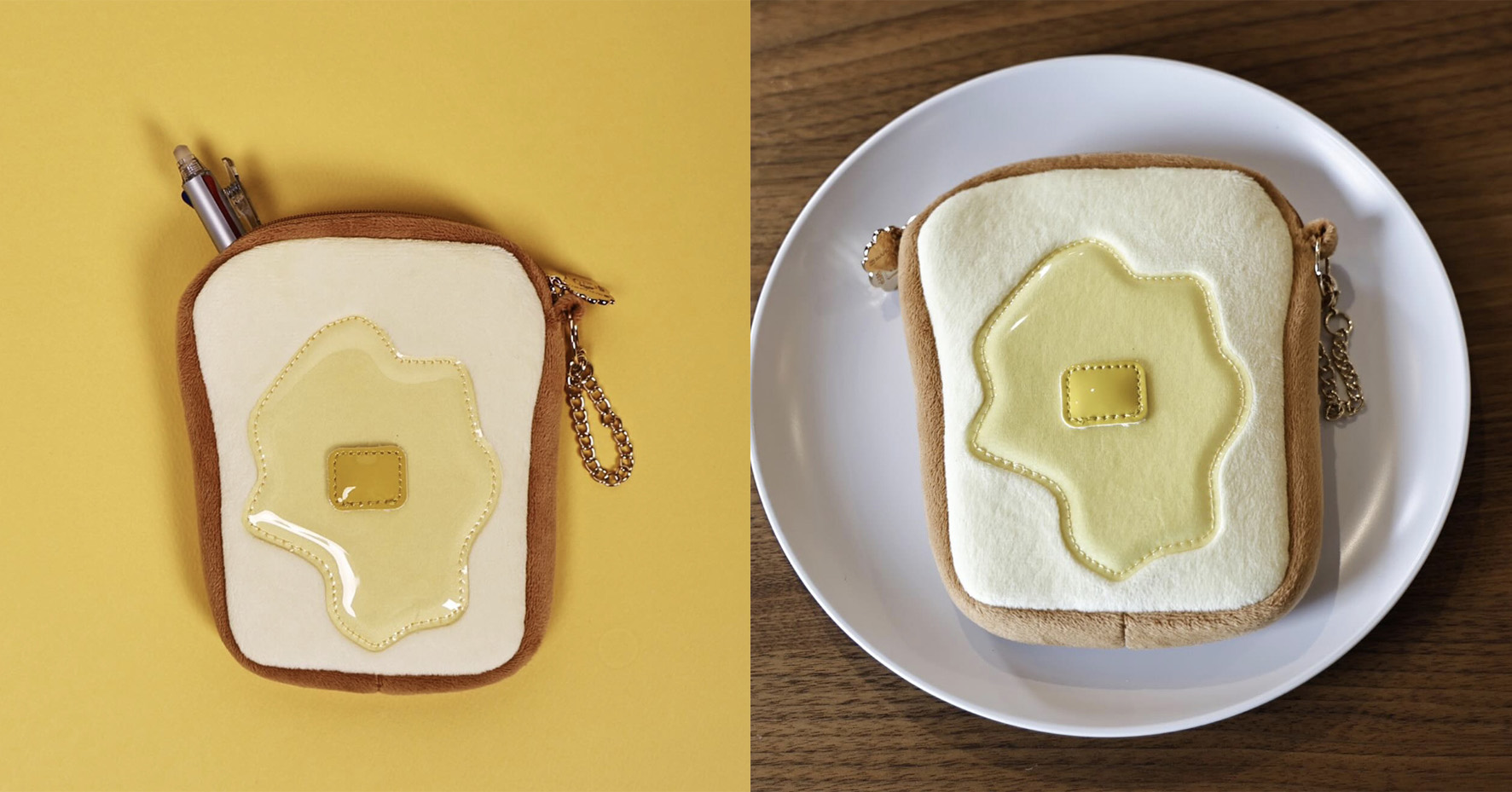 而除了食品包裝造型之外,也有以食物本身為造型的設計,像是這款奶油吐司造型收納包,吐司表面上還有奶油融化的模樣做裝飾,造型性十足。這款收納包的容量很適合放入一些平常需要隨身攜帶的小物,比如:護手霜、護唇膏、眼藥水、小鏡子等隨身物品。