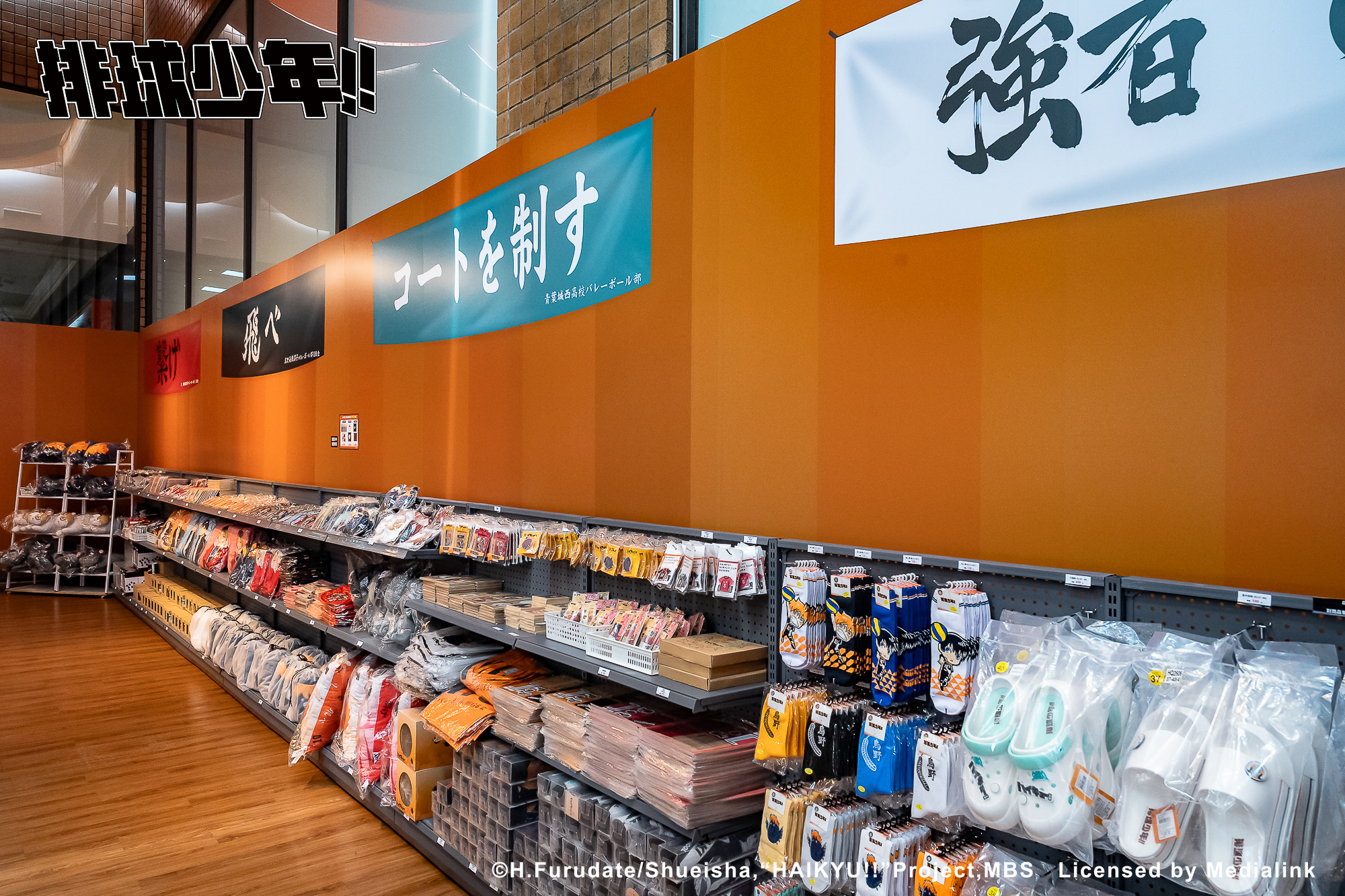 抬頭牆上有五面學校應援旗,從青葉城西高中的「制霸球場」到音駒高中的「維繫」,看了好想吶喊起來!另一面還有「一球入魂」的梟谷學園高中主將木兔及赤葦、白鳥澤學園的牛島和天童,不論最喜歡什麼角色,都能在店內找到!最後來到「坂之下商店」大扭蛋,看能夠把什麼好貨給帶回家吧!